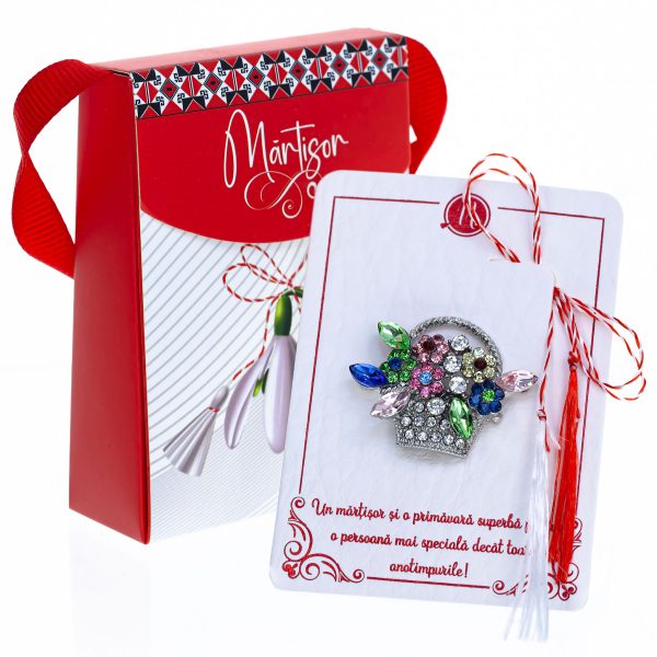 Broșă Mărțișor Gentuță – Coșuleț Argintiu cu Floricele