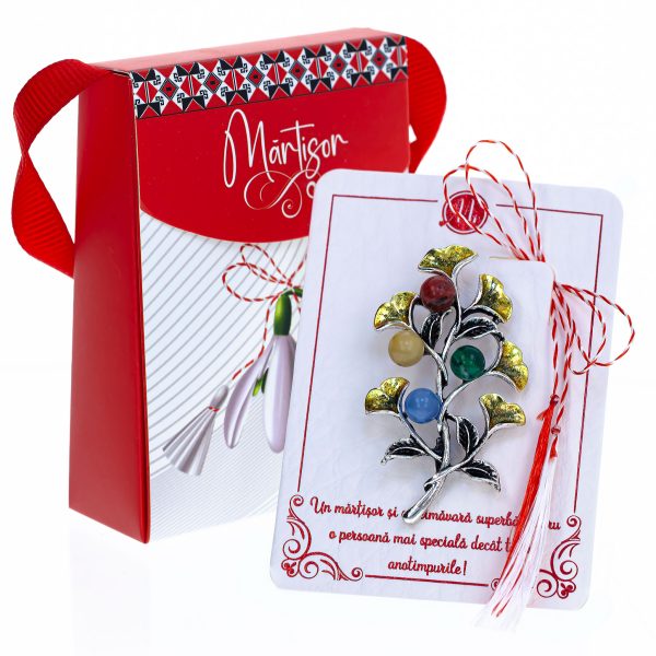 Broșă Mărțișor Gentuță – Frunză Aurie cu Pietricele