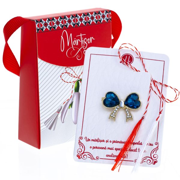 Broșă Mărțișor Gentuță – Fundă Aurie cu Pietre Albastre
