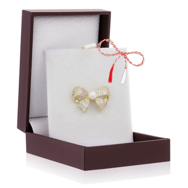Broșă Pin Premium Gold Plated – Fundiță cu Perluțe