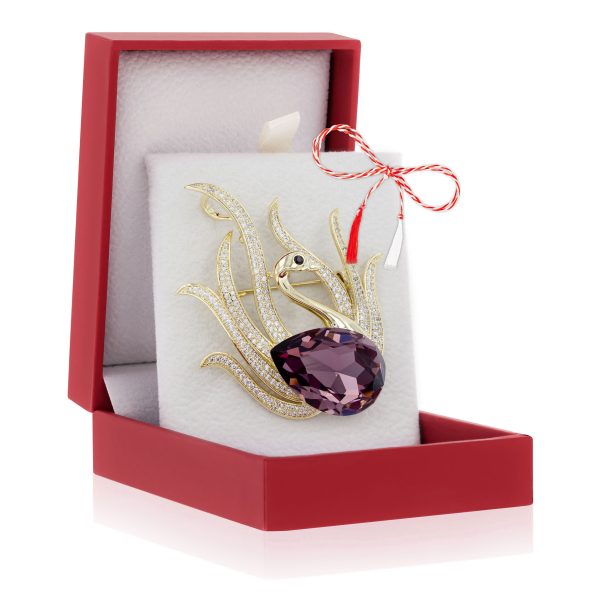 Broșă PREMIUM Gold Plated – Lebădă Aurie cu Piatră Roz