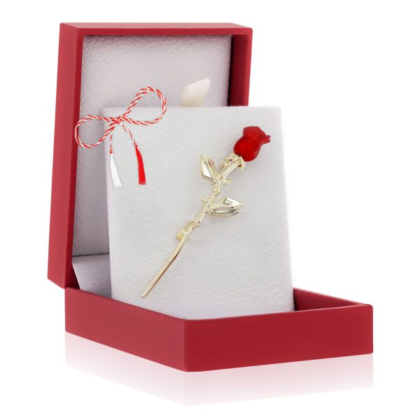 Broșă PREMIUM Gold Plated – Model Boboc de Trandafir Roșu