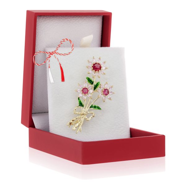 Broșă Premium Gold Plated – Buchet cu Pietre Roșii