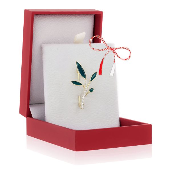 Broșă PREMIUM Gold Plated – Crenguță cu Frunze Verzi