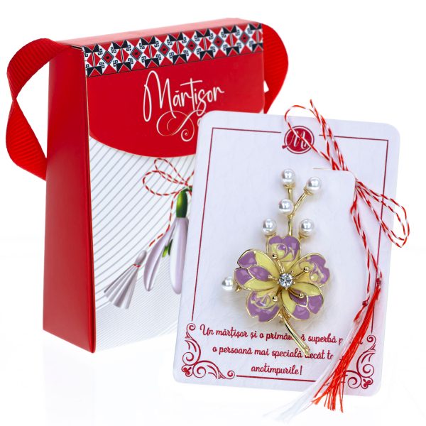 Broșă Mărțișor Gentuță – Floare Aurie cu Petale Mov
