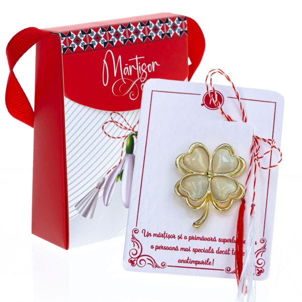 Broșă Mărțișor Gentuță – Trifoi Auriu cu Petale Inimioare