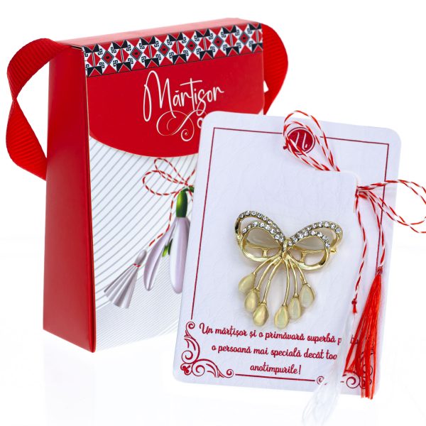 Broșă Mărțișor Gentuță – Fundiță Aurie Stilizată