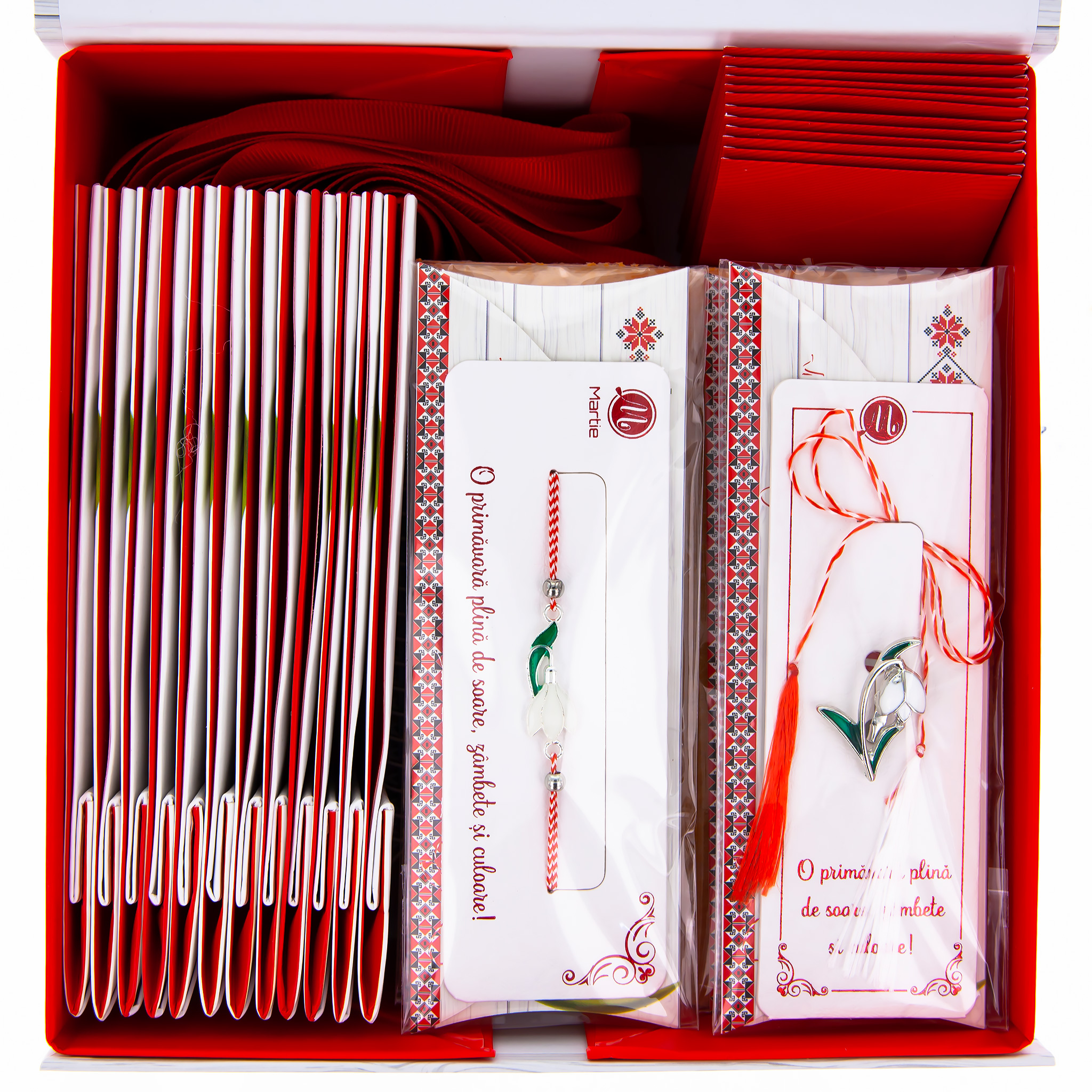 Celebrează tradiția și frumusețea primăverii cu setul nostru exclusiv de mărțișoare! Acest pachet oferă 6 brățări și 6 broșe de diferite modele, 12 pungi cadou și 12 plicuri cu felicitare pentru mesaj. Mărțișoarele sunt ambalate individual, însoțite de suport pentru brățară/broșă și plic, ideale pentru a fi oferite de 1 Martie.