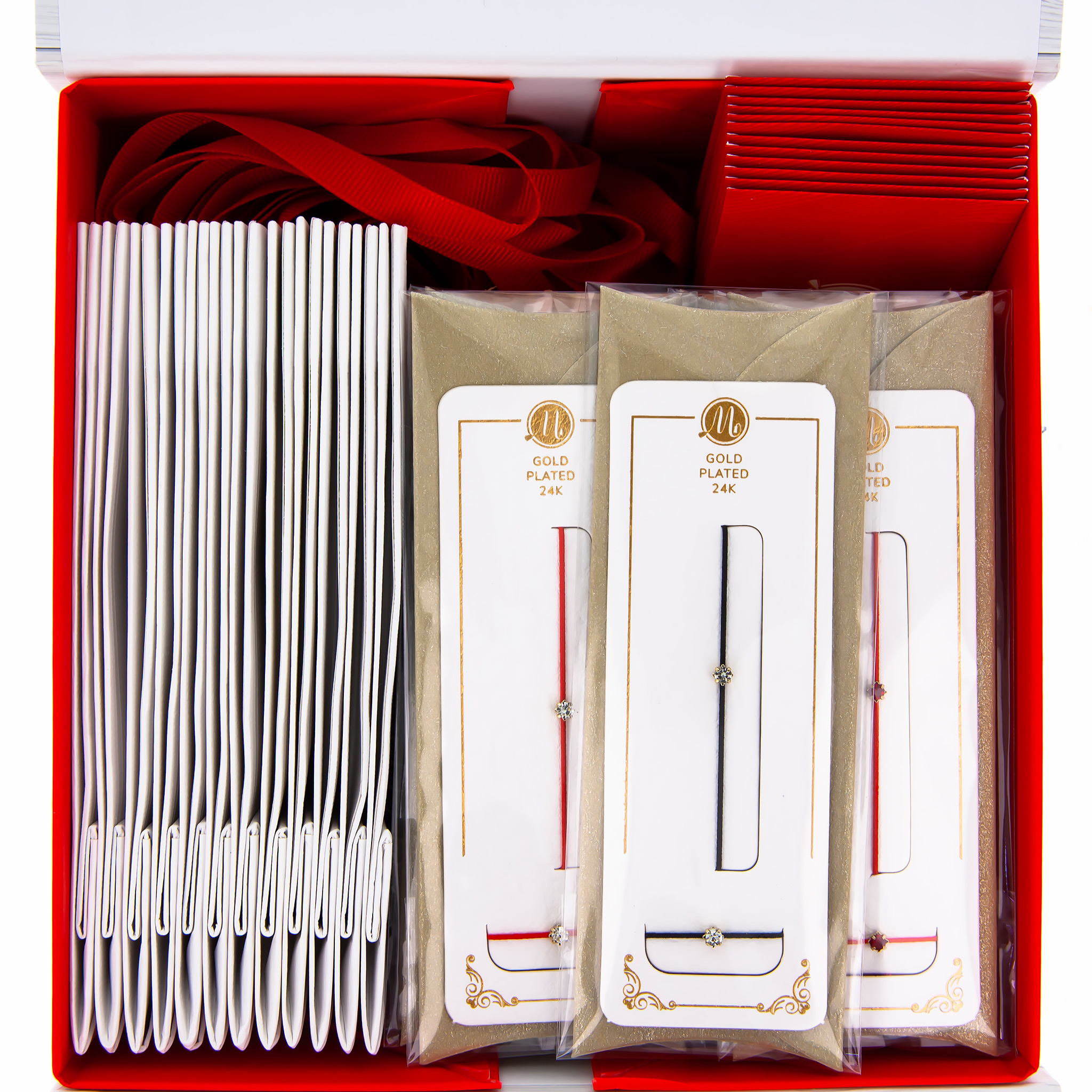 Celebrează tradiția și frumusețea primăverii cu pachetul nostru exclusiv de mărțișoare! Acesta oferă 12 seturi gold plated, formate din brățară și inel(4 seturi cu fir elastic negru și zirconiu alb, 4 seturi cu fir elastic roșu și zirconiu alb, 4 seturi cu fir elastic roșu și zirconiu roșu), 12 pungi cadou și 12 plicuri cu felicitare pentru mesaj. Mărțișoarele sunt ambalate individual, însoțite de suport și plic, ideale pentru a fi oferite de 1 Martie.