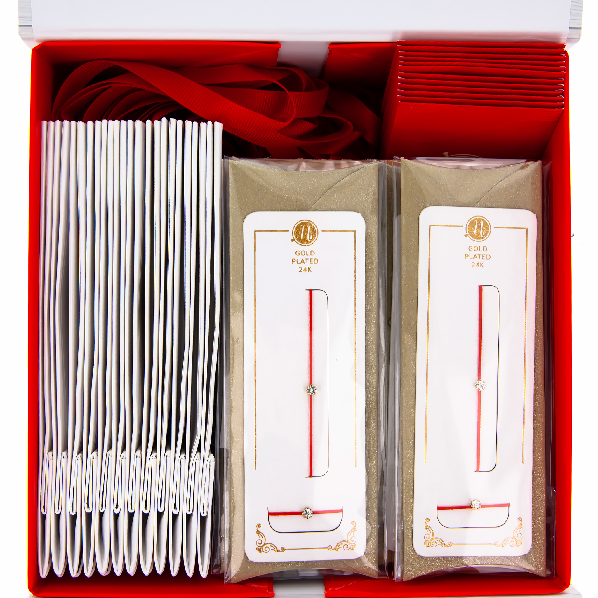 - 12 Seturi Red Gold Plated: Seturile sunt formate din brățară și inel cu fir elastic roșu care asigură o potrivire confortabilă, oferind un accesoriu ușor de purtat și extrem de versatil. Pietricelele de zirconiu alb adaugă o notă de eleganță, transformând setul într-un accesoriu deosebit, iar finisajul gold plated oferă o strălucire discretă.