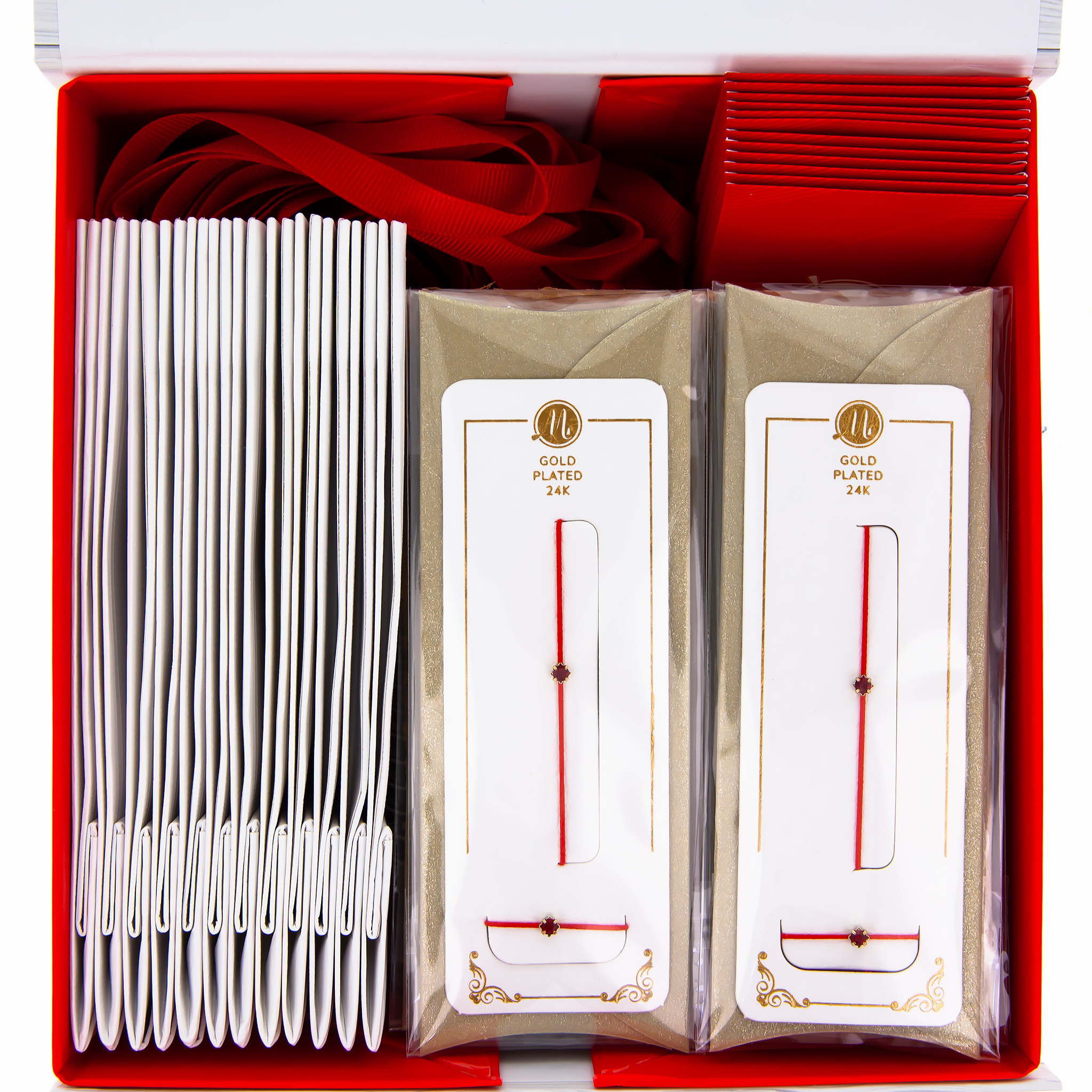 Celebrează tradiția și frumusețea primăverii cu pachetul nostru exclusiv de mărțișoare! Acesta oferă 12 seturi gold plated, formate din brățară și inel cu fir elastic roșu și pietricele zirconiu roșu, 12 pungi cadou și 12 plicuri cu felicitare pentru mesaj. Mărțișoarele sunt ambalate individual, însoțite de suport și plic, ideale pentru a fi oferite de 1 Martie.