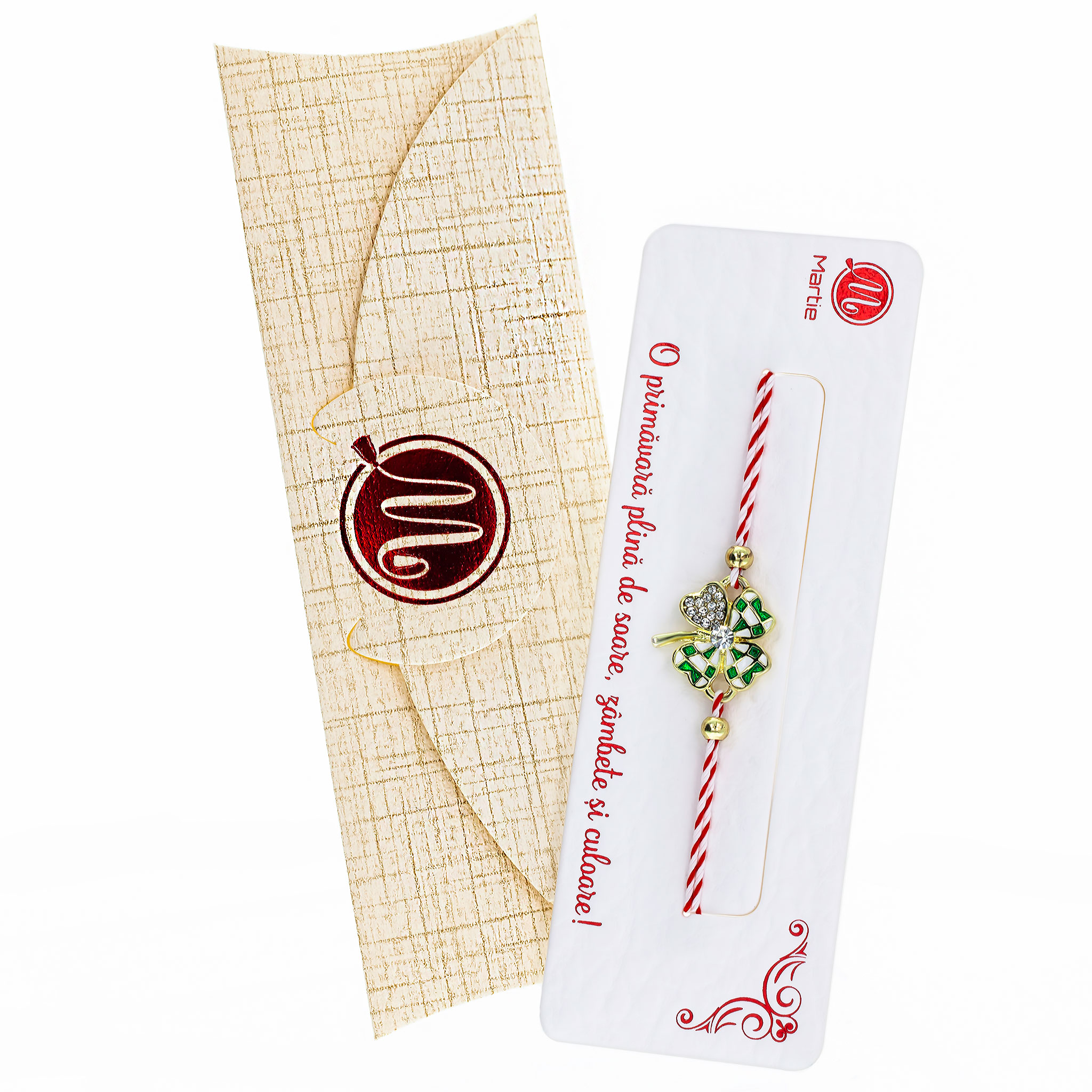 - Brățară Mărțișor cu fir textil alb-roșu, pandantiv trifoi cu pietricele, ambalată pe suport de carton cu mesaj de primăvară, însoțită de ambalaj tip plic, pregătită cu grijă pentru a fi oferită drept un cadou special.