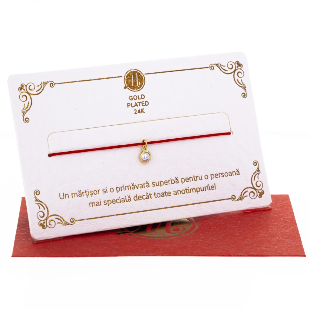 - Brățară Mărțișor din fir textil roșu, charm auriu gold plated, ambalată pe suport, însoțită de ambalaj tip plic, pregătită cu grijă pentru a fi oferită drept un cadou special, simbol al celor mai frumoase intenții și sentimente.