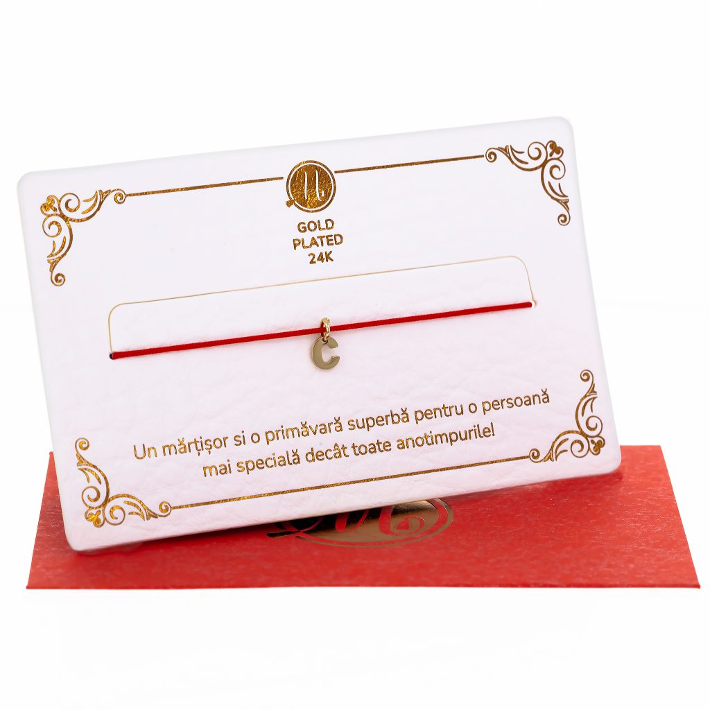- Brățară Mărțișor cu fir textil roșu, charm inițială, ambalată pe suport, însoțită de ambalaj tip plic, pregătită cu grijă pentru a fi oferită drept un cadou special și unic.