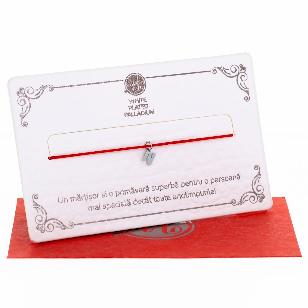 - Brățară Mărțișor cu fir textil roșu, charm inițială, ambalată pe suport, însoțită de ambalaj tip plic, pregătită cu grijă pentru a fi oferită drept un cadou special și unic.