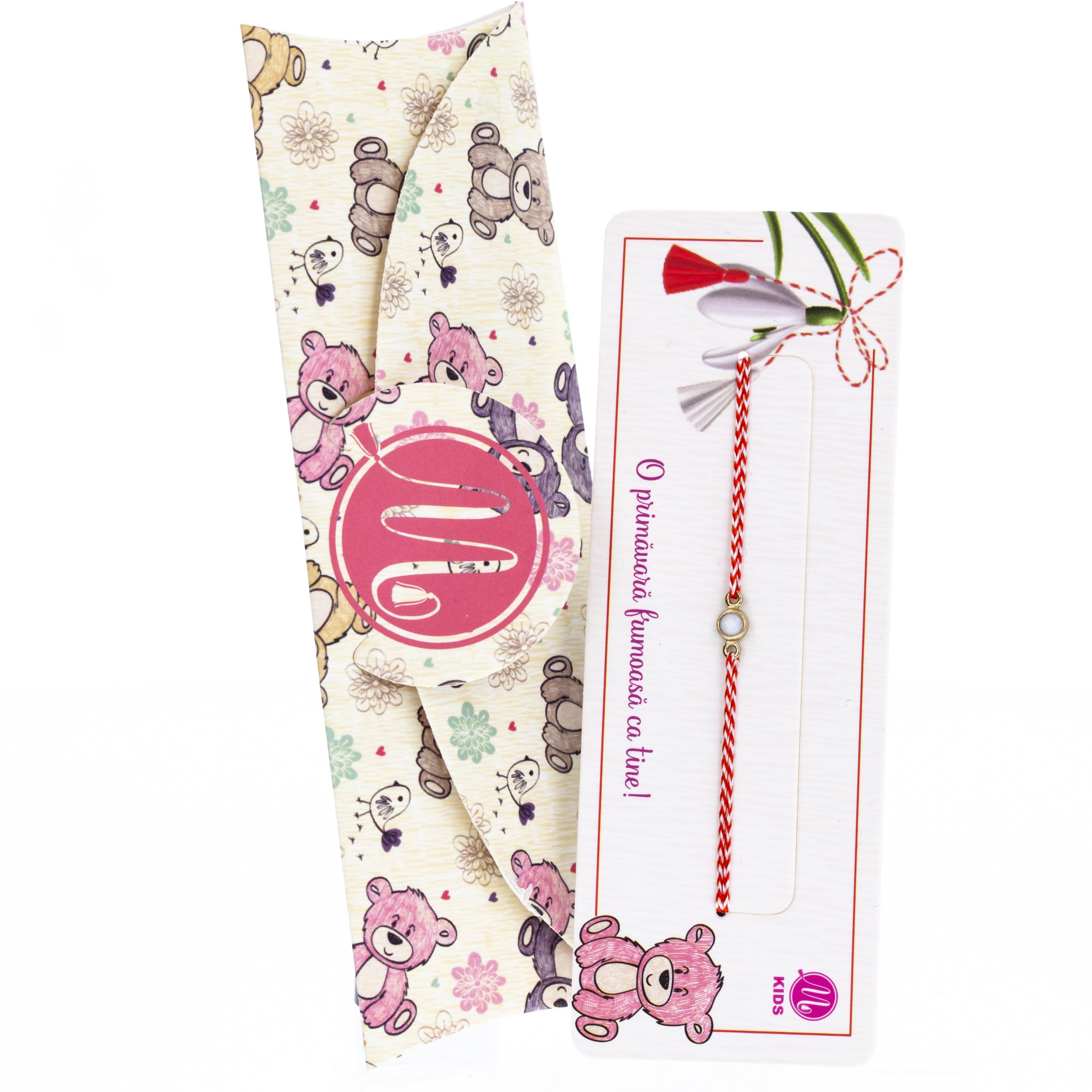 - Brățară Marțișor Copii – Cristal White Marble, ambalată pe suport de carton, pregătită cu grijă pentru a fi oferită drept un cadou special.