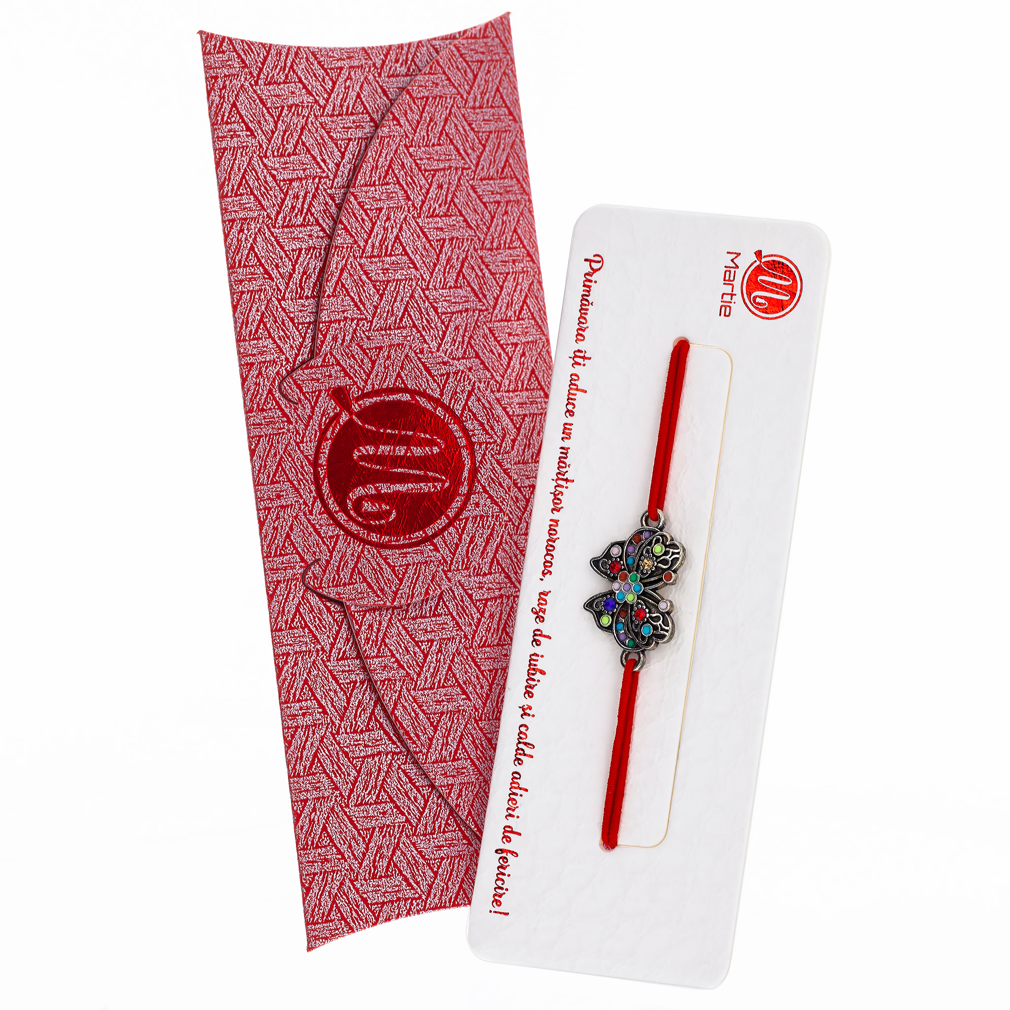 - Brățară Mărțișor cu fir textil roșu, pandantiv fluturaș, ambalată în plic rosu tip felicitare cu mesaj de primăvară, pregătită cu grijă pentru a fi oferită drept un cadou special.