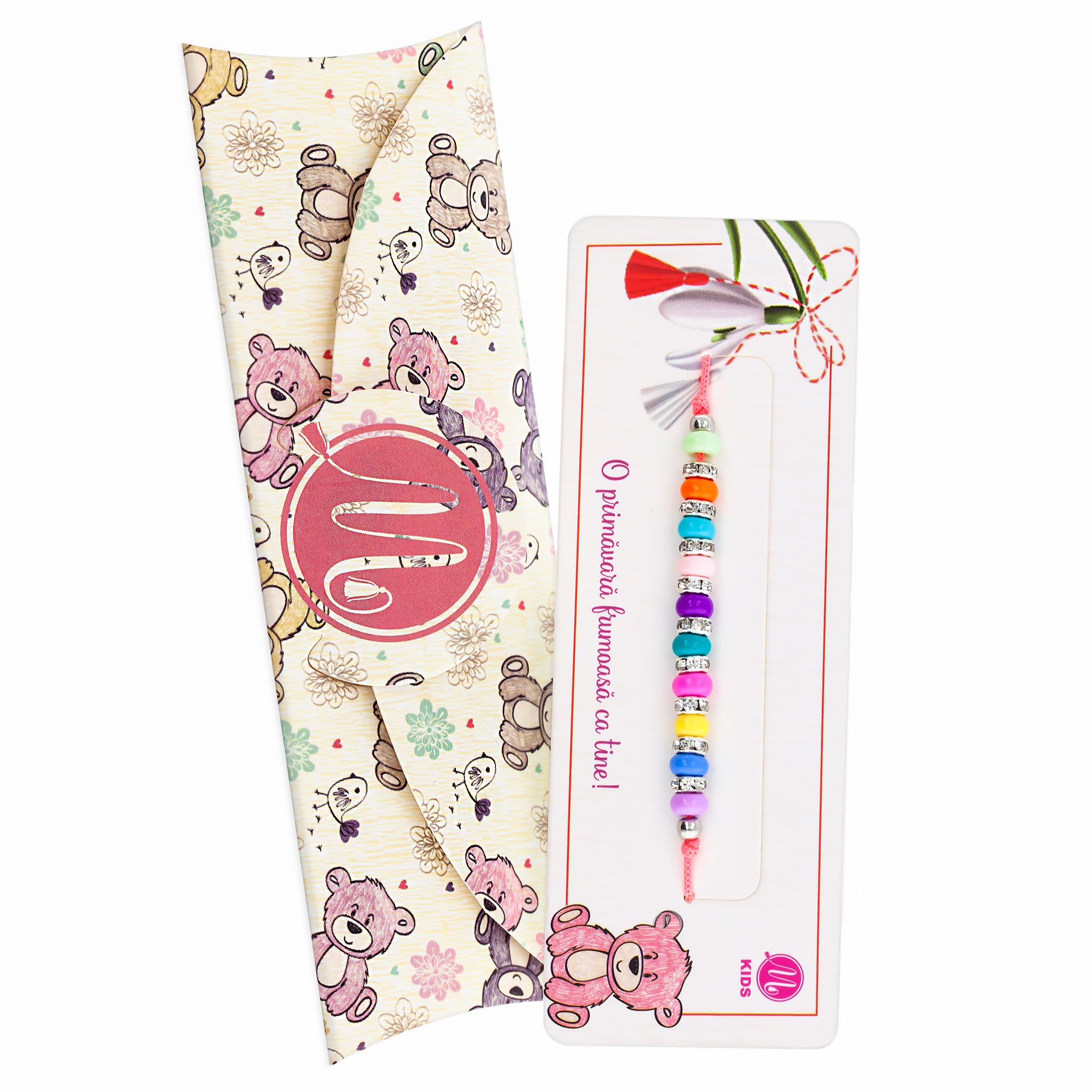 - Brățară Rainbow Roz, ambalată pe suport de carton și plic, pregătită cu grijă pentru a fi oferită drept un cadou special.
