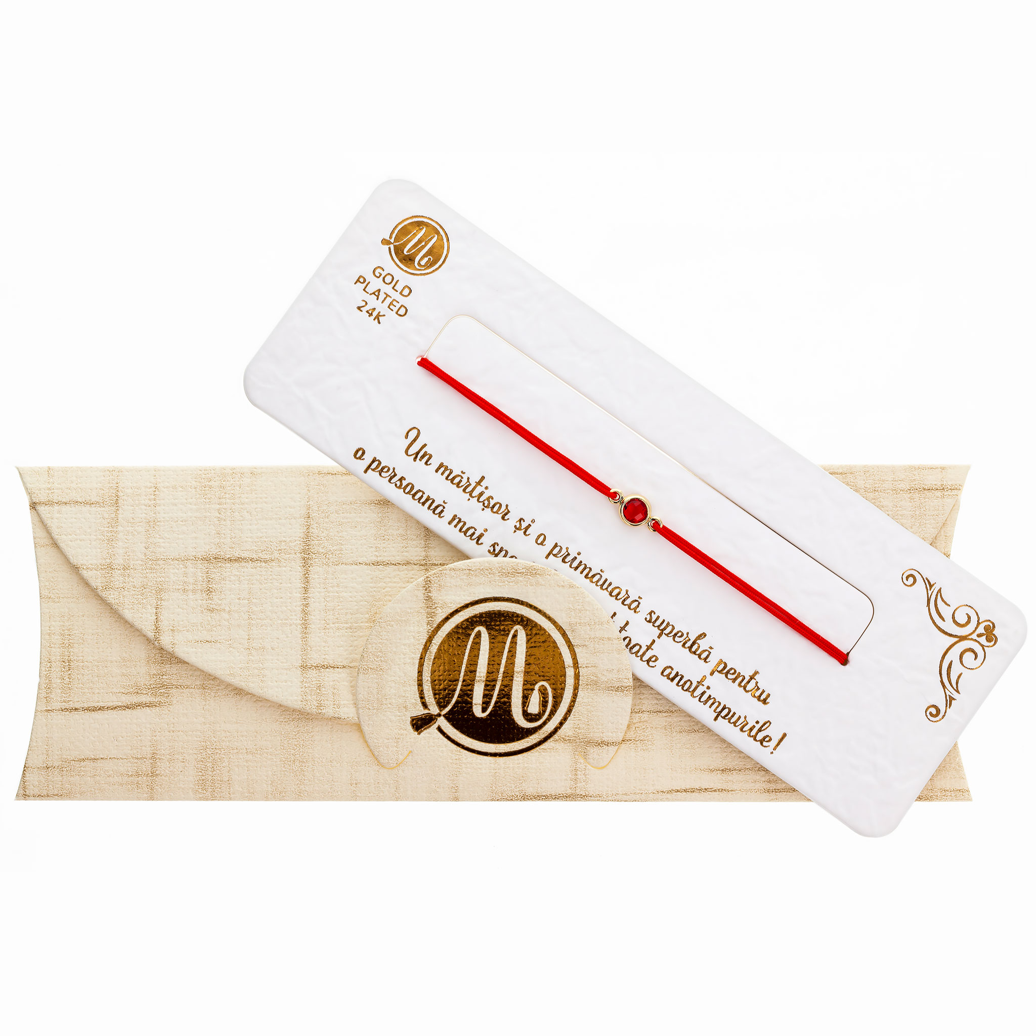 - Brățară Mărțișor cu fir textil roșu, charm auriu gold plated, însoțită de ambalaj tip plic, pregătită cu grijă pentru a fi oferită drept un cadou special, simbol al celor mai frumoase intenții și sentimente.