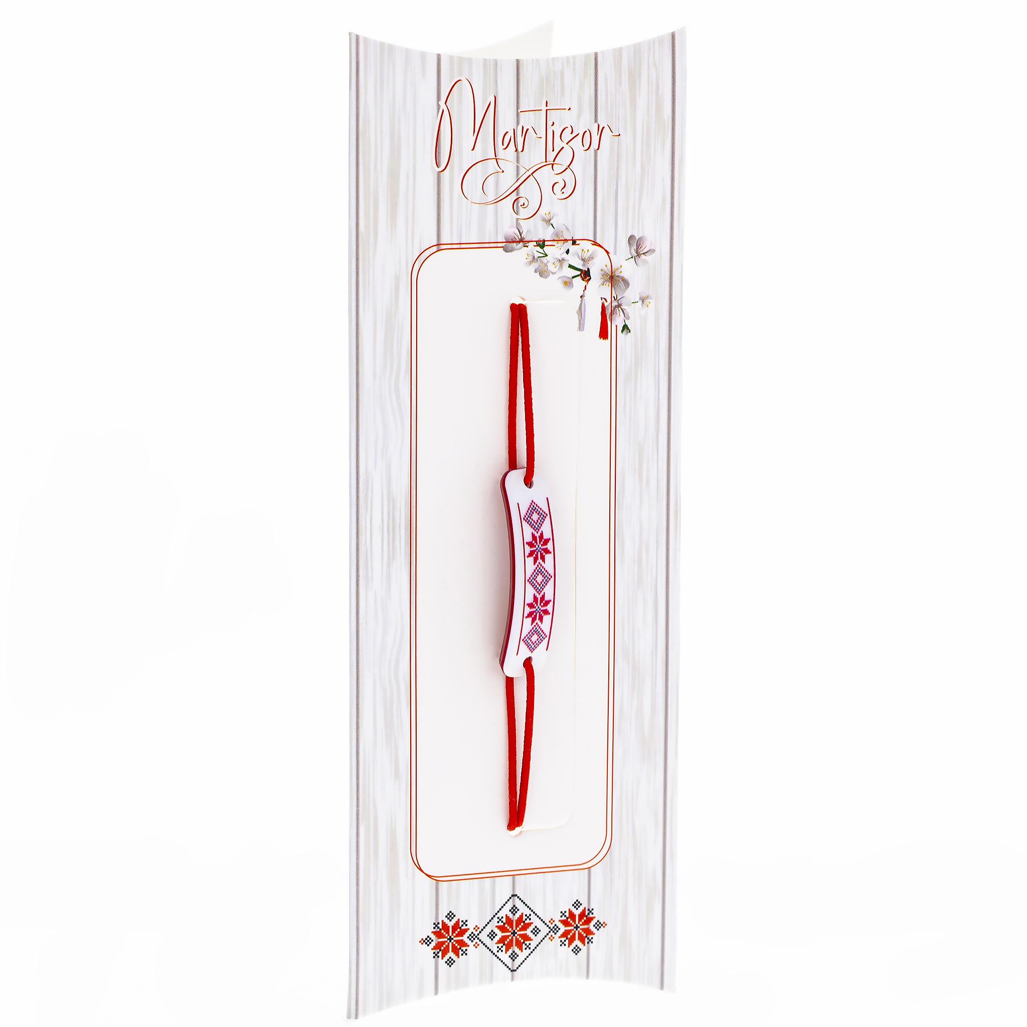 - Brățară Mărțișor cu fir elastic roșu, pandantiv motive tradiționale, ambalată pe suport de carton tip felicitare, pregătită cu grijă pentru a fi oferită drept un cadou special, simbol al celor mai frumoase intenții și sentimente.