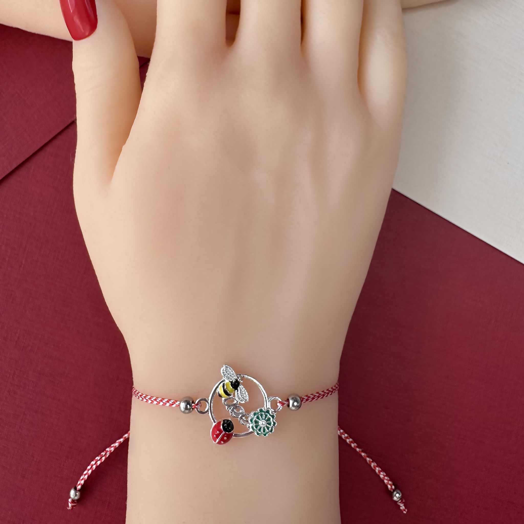 Această brățară transmite emoția bucuriei și a prieteniei prin delicatețea albinuței și veselia buburuzei. Îmbină tradiția firului alb-roșu cu simbolurile naturii, amintind de armonia primăverii și de legăturile speciale dintre oameni. Este o bijuterie care exprimă optimism, noroc și iubire.