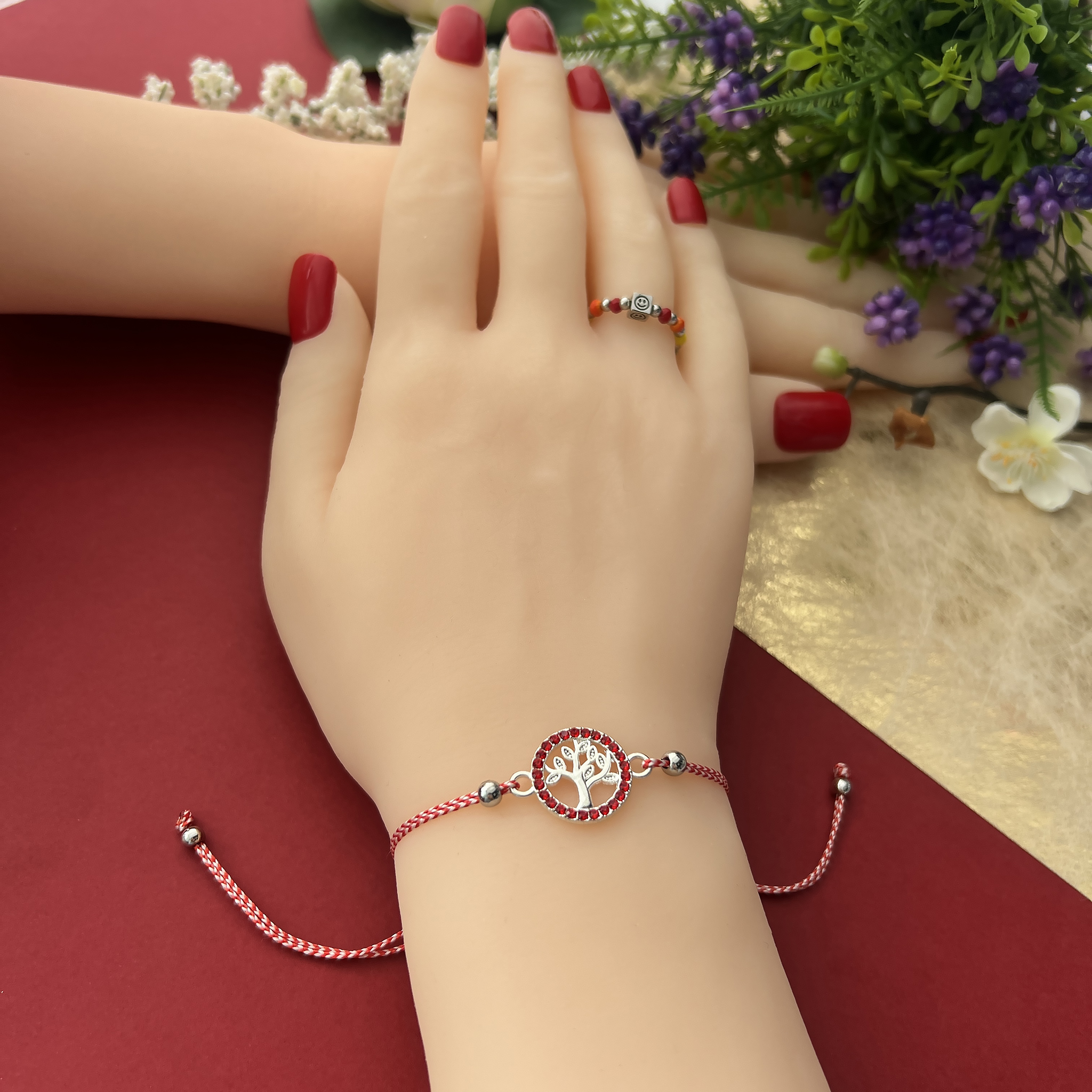 Această brățară poartă cu sine simbolul echilibrului și al forței interioare prin pandantivul Copacul Vieții. Arborele sugerează înțelepciune și legătura cu rădăcinile, iar cristalul roșu adaugă energie, pasiune și vitalitate. Șnurul alb-roșu completează tradiția Mărțișorului, transformând această bijuterie într-un talisman cu profunde semnificații.