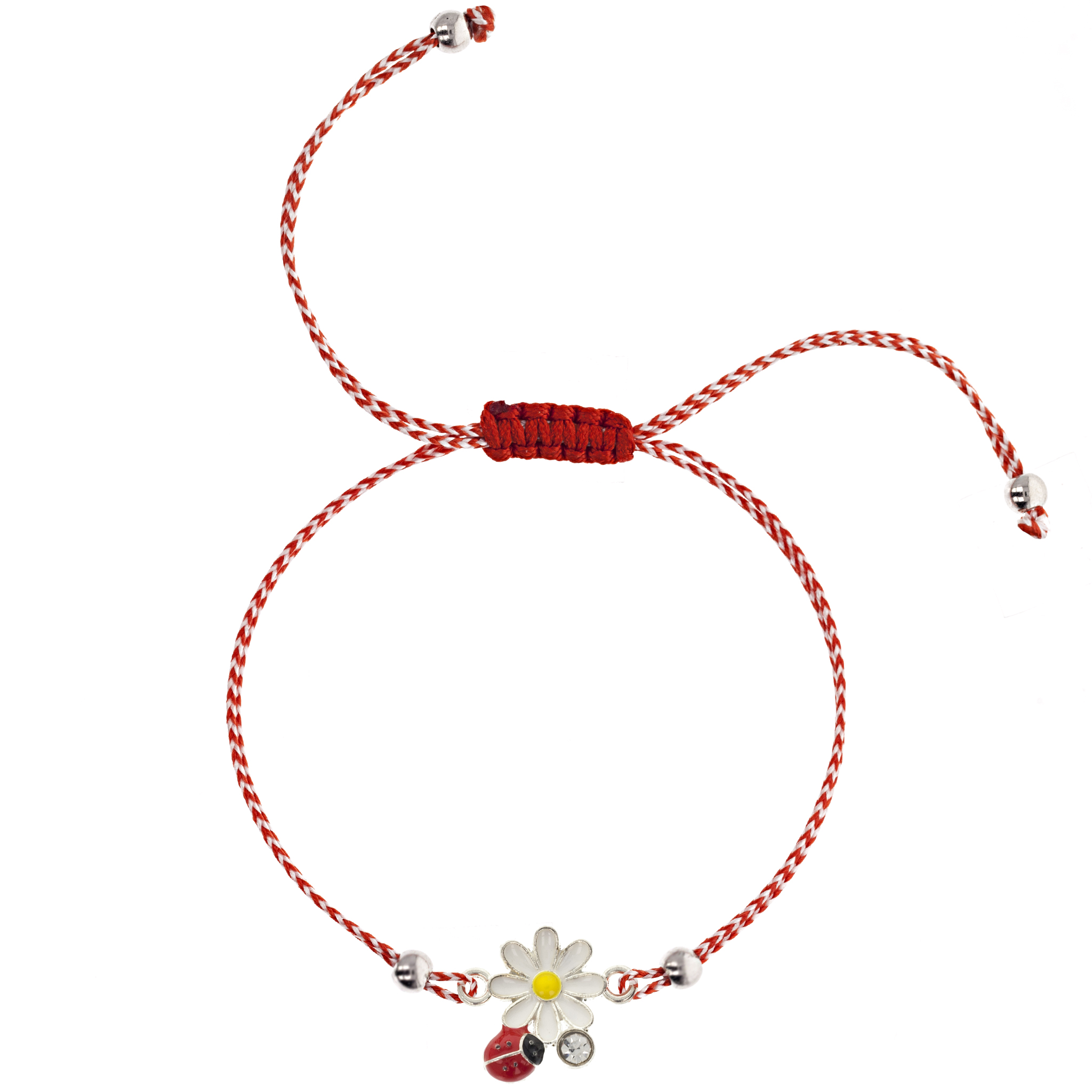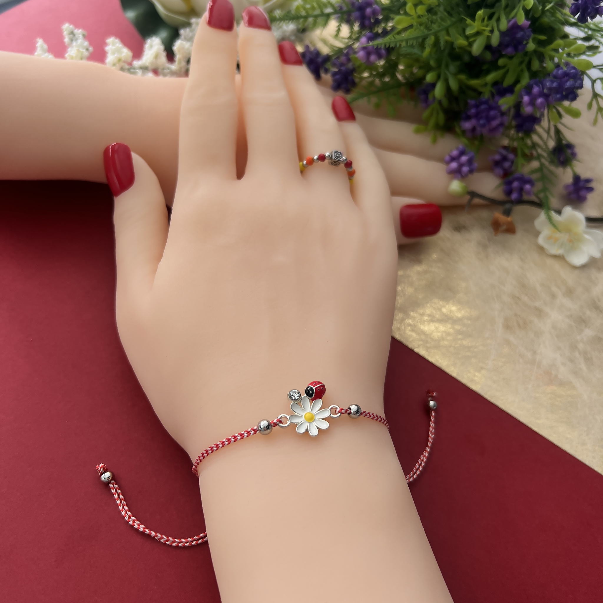 Această brățară aduce pe încheietura ta frumusețea și gingășia naturii prin pandantivul în formă de floare delicată pe care se regăsește o gărgăriță norocoasă. Firul alb-roșu tradițional evocă farmecul și simbolismul Mărțișorului, iar detaliile pandantivului amintesc de prospețimea primăverii și de bucuria renașterii. Este o bijuterie care transmite optimism, căldură și noroc, fiind un cadou cu adevărat special.
