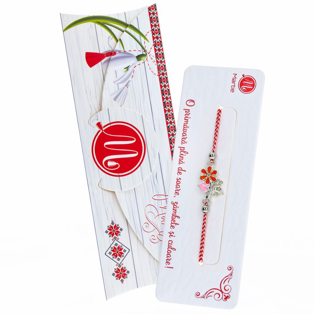 - Brățară Mărțișor cu fir textil alb-roșu, pandantiv floricică portocalie, ambalată pe suport de carton cu mesaj de primăvară, însoțită de ambalaj tip plic, pregătită cu grijă pentru a fi oferită drept un cadou special.