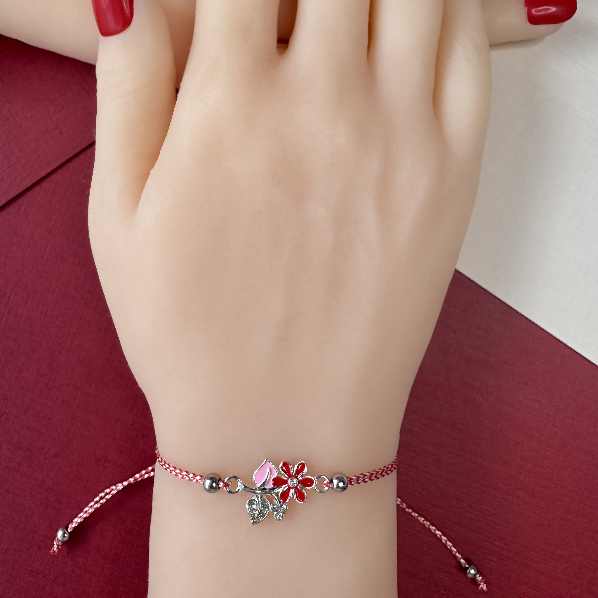 Această brățară Mărțișor este o bijuterie delicată și expresivă, care aduce primăvara pe încheietura ta prin floricica roșie, simbol al pasiunii și energiei pozitive.