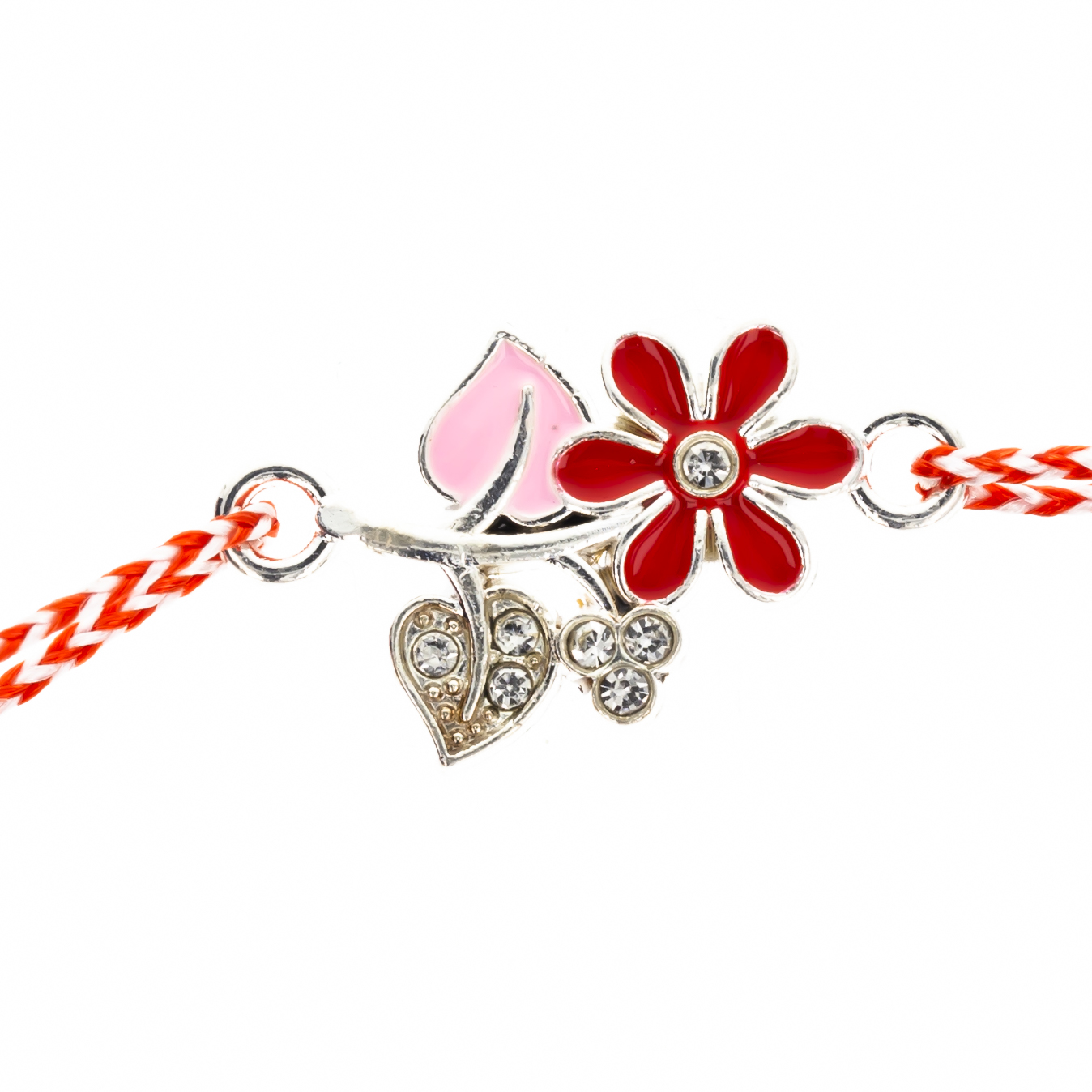 • Material: Fir textil alb-roșu, pandantiv floricică roșie din metale comune;