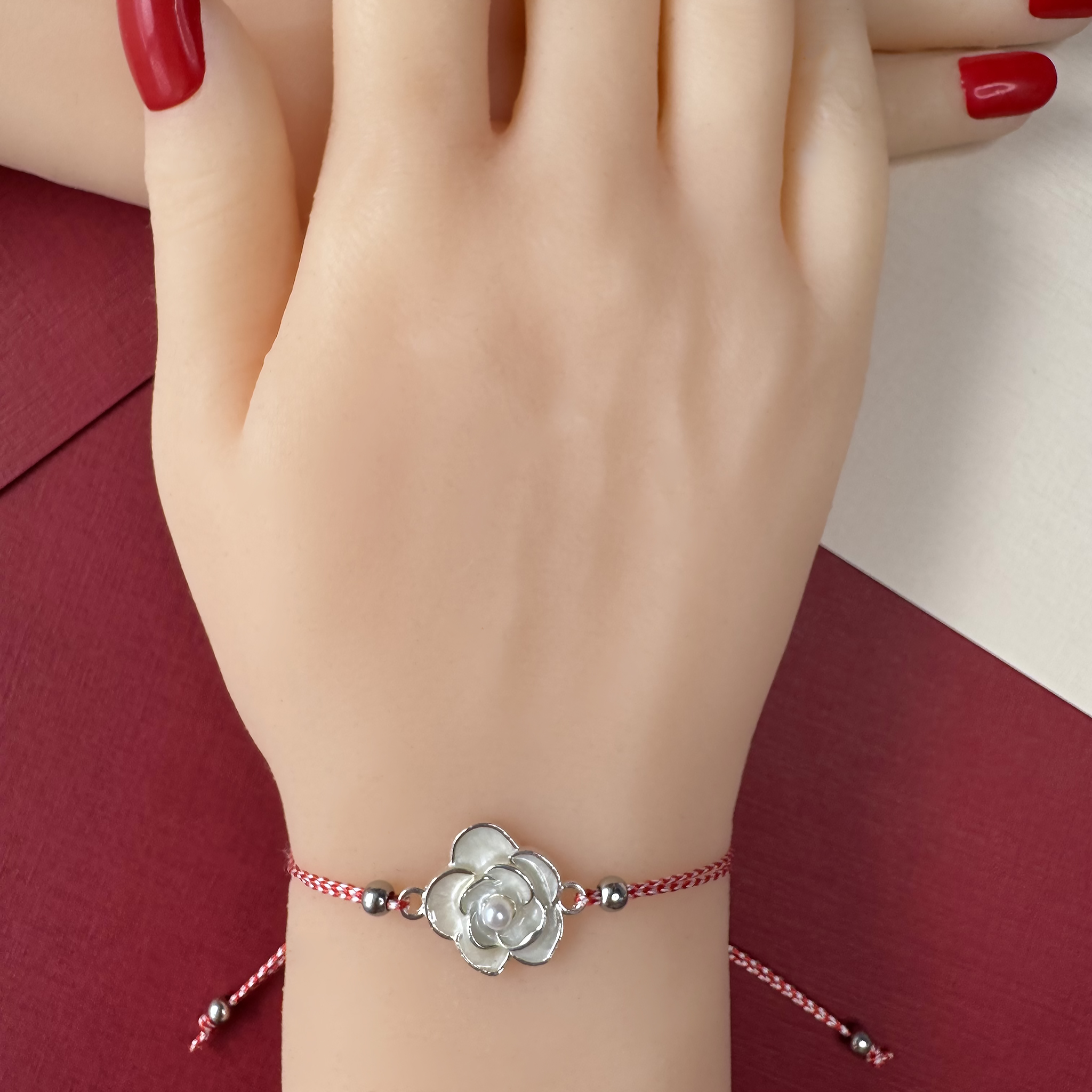 Această brățară transmite emoția naturii și a prospețimii prin floricica delicată a pandantivului. Combinată cu șnurul alb-roșu tradițional, bijuteria evocă armonia dintre tradiție și prezent, amintind de legăturile autentice și de momentele speciale care aduc bucurie și speranță. Este un accesoriu care inspiră gingășie, optimism și afecțiune.