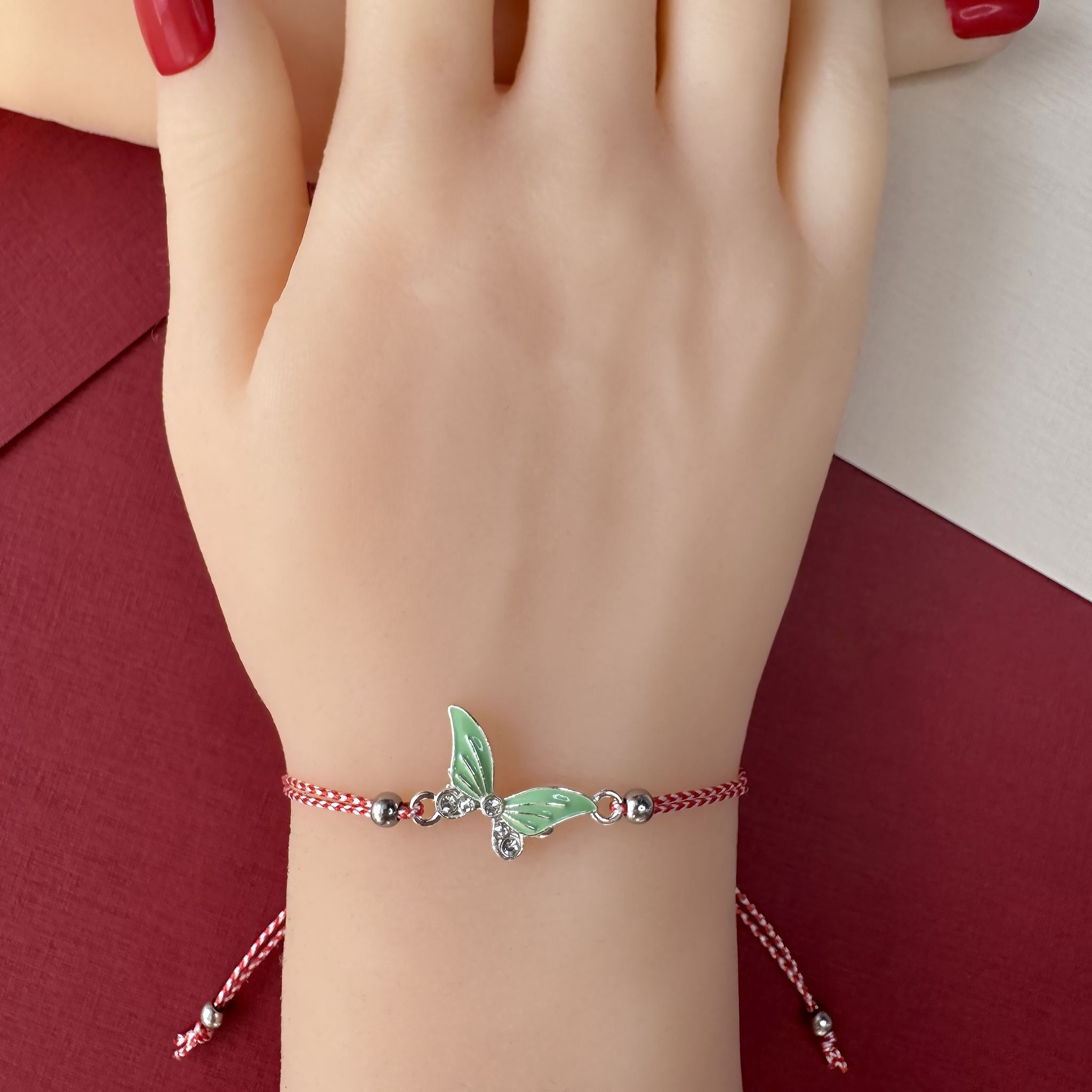 Această brățară aduce pe încheietura ta prospețime și energie primăvăratică prin pandantivul în formă de fluturaș cu aripioare verzi. Firul alb-roșu tradițional se împletește armonios cu bijuteria, evocând legătura dintre tradiție și frumusețea prezentului. Este o bijuterie care inspiră optimism, gingășie și momente pline de bucurie, fiind un cadou plin de semnificație.