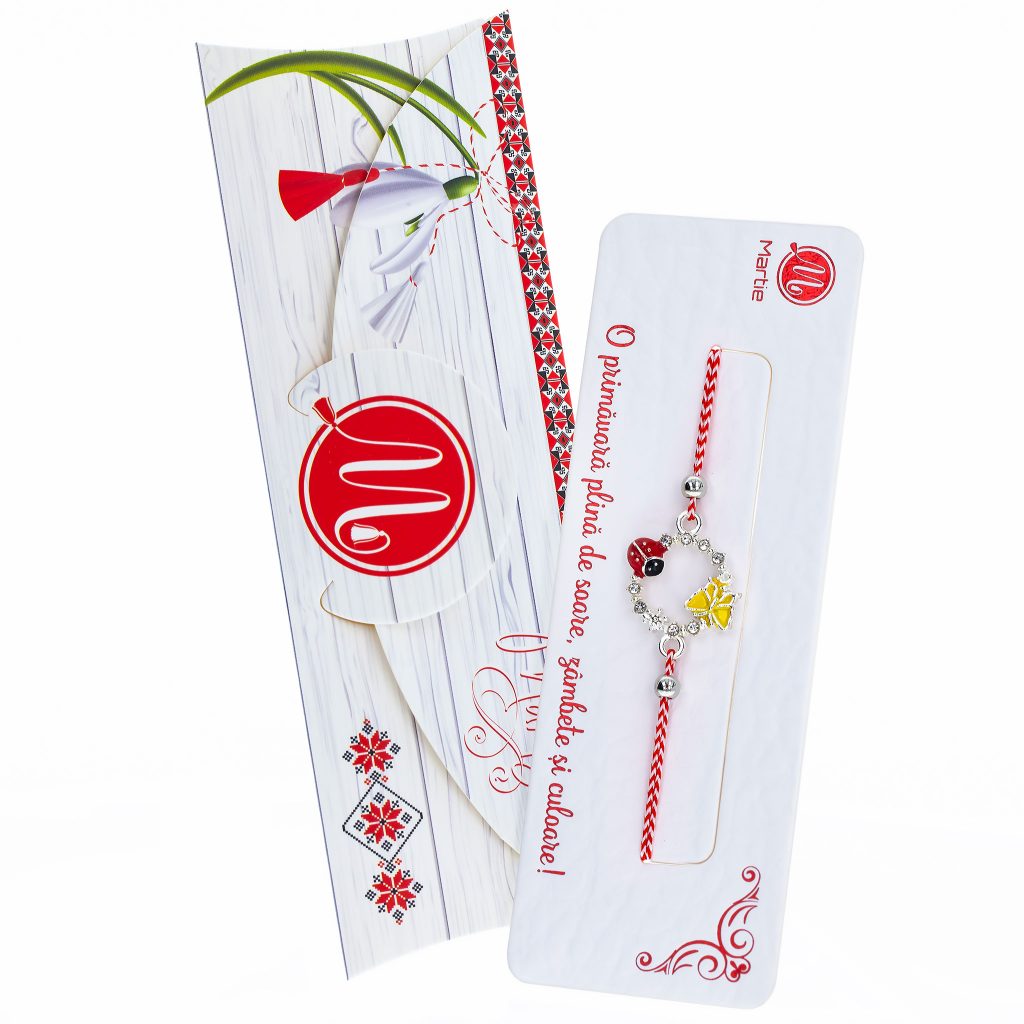 - Brățară Mărțișor cu fir textil alb-roșu, pandantiv fluturaș galben și buburuză, ambalată pe suport de carton cu mesaj de primăvară, însoțită de ambalaj tip plic, pregătită cu grijă pentru a fi oferită drept un cadou special.