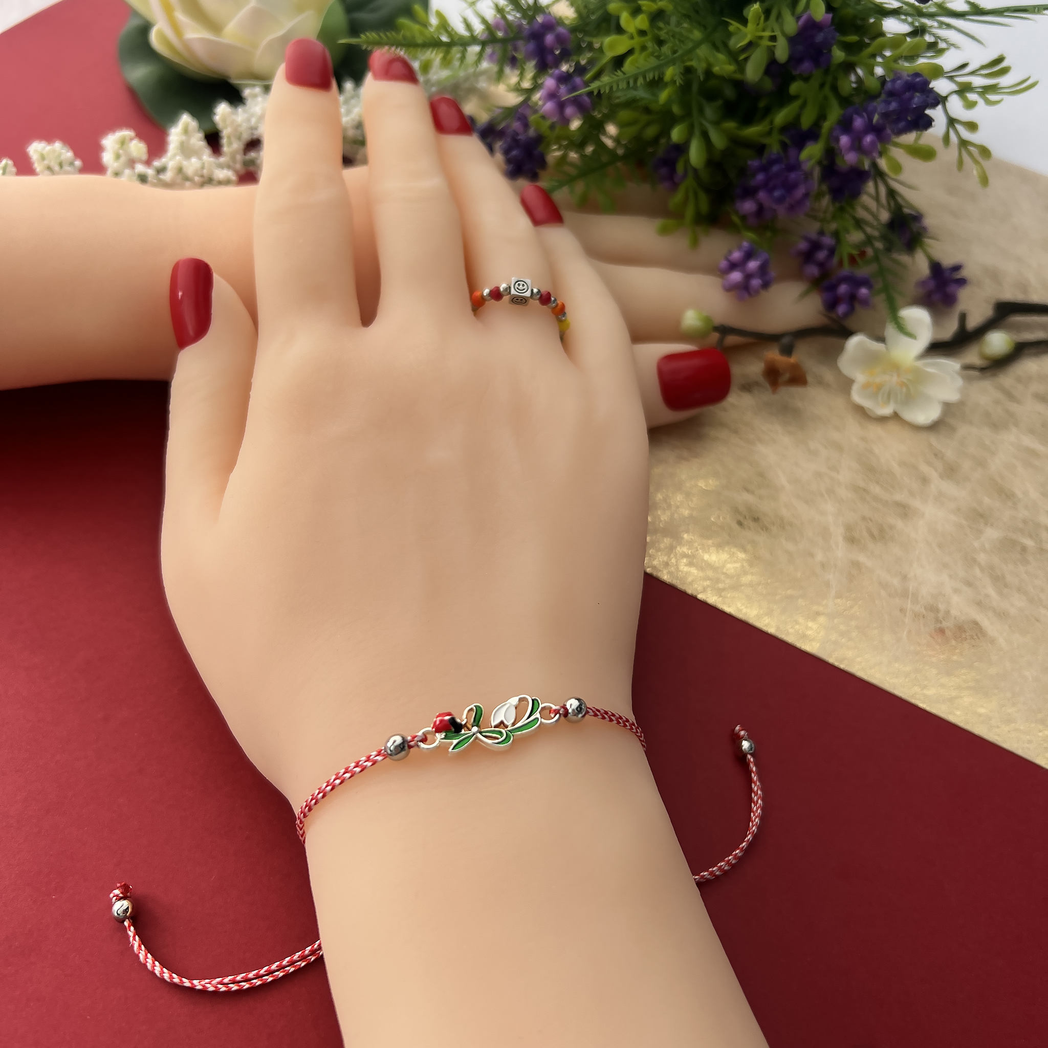 Această brățară aduce împreună frumusețea tradiției și delicatețea simbolurilor primăverii. Pandantivul în formă de fundiță, îmbogățit cu un ghiocel gingaș și o buburuză veselă, transmite speranță, noroc și renaștere. Șnurul alb-roșu completează armonios designul, făcând din această brățară un dar plin de semnificație și emoție.