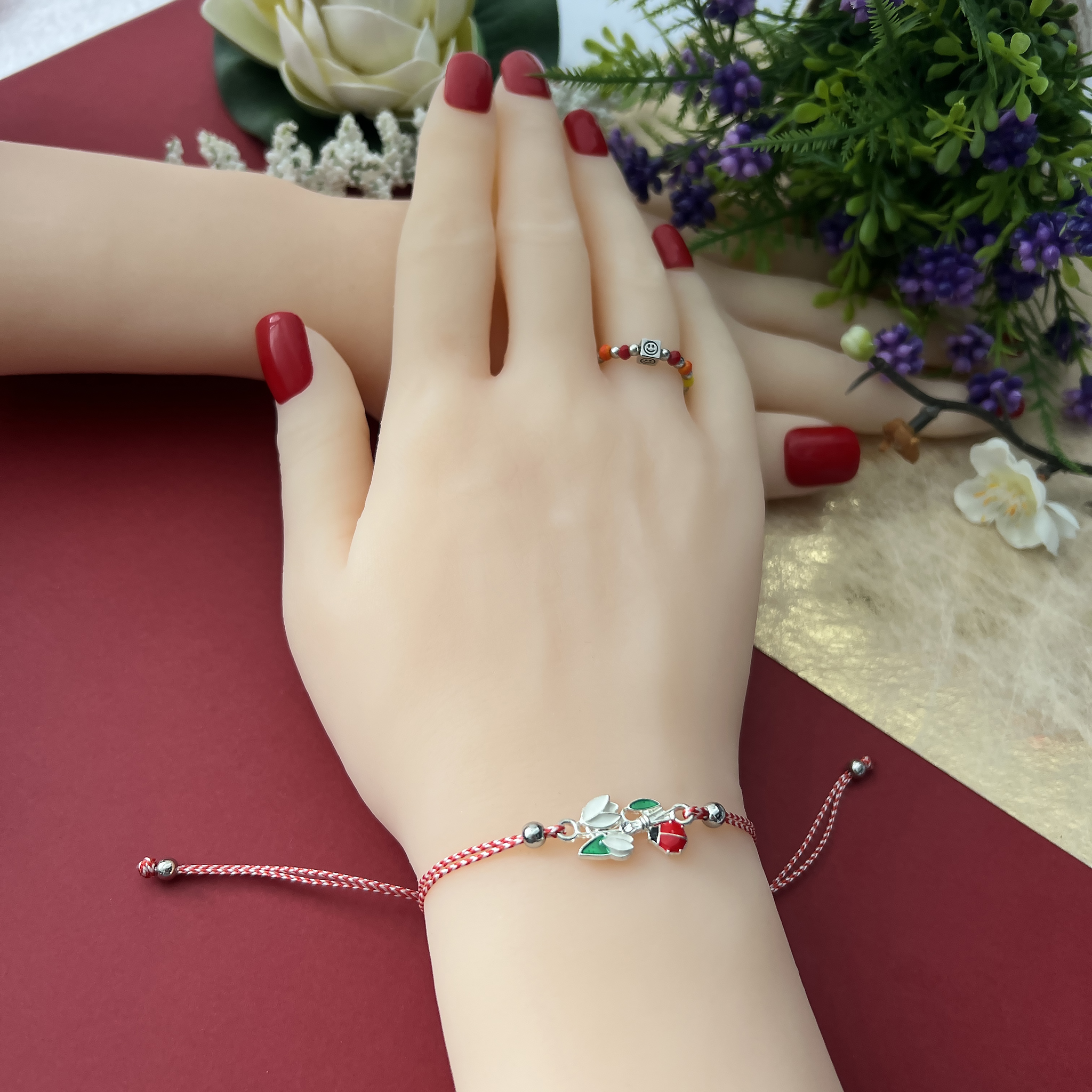 - Fir Textil Alb-Roșu: Firul textil alb-roșu adaugă o notă tradițională și festivă brățării, păstrând astfel spiritul autentic al Mărțișorului. Această combinație de culori simbolizează regenerarea și echilibrul.