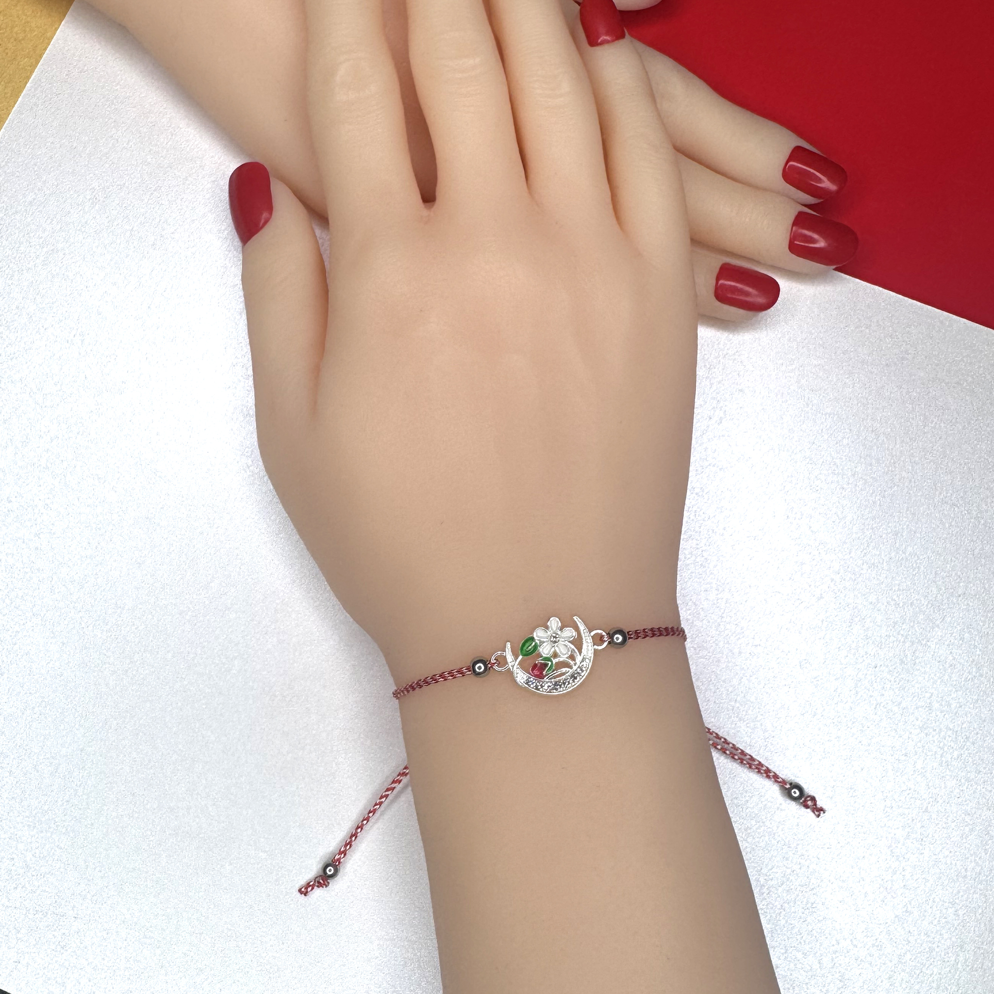 Această brățară Mărțișor este o bijuterie delicată și plină de semnificație, ce îmbină tradiția firului alb-roșu cu simbolurile primăverii: ghioceii și floricica.