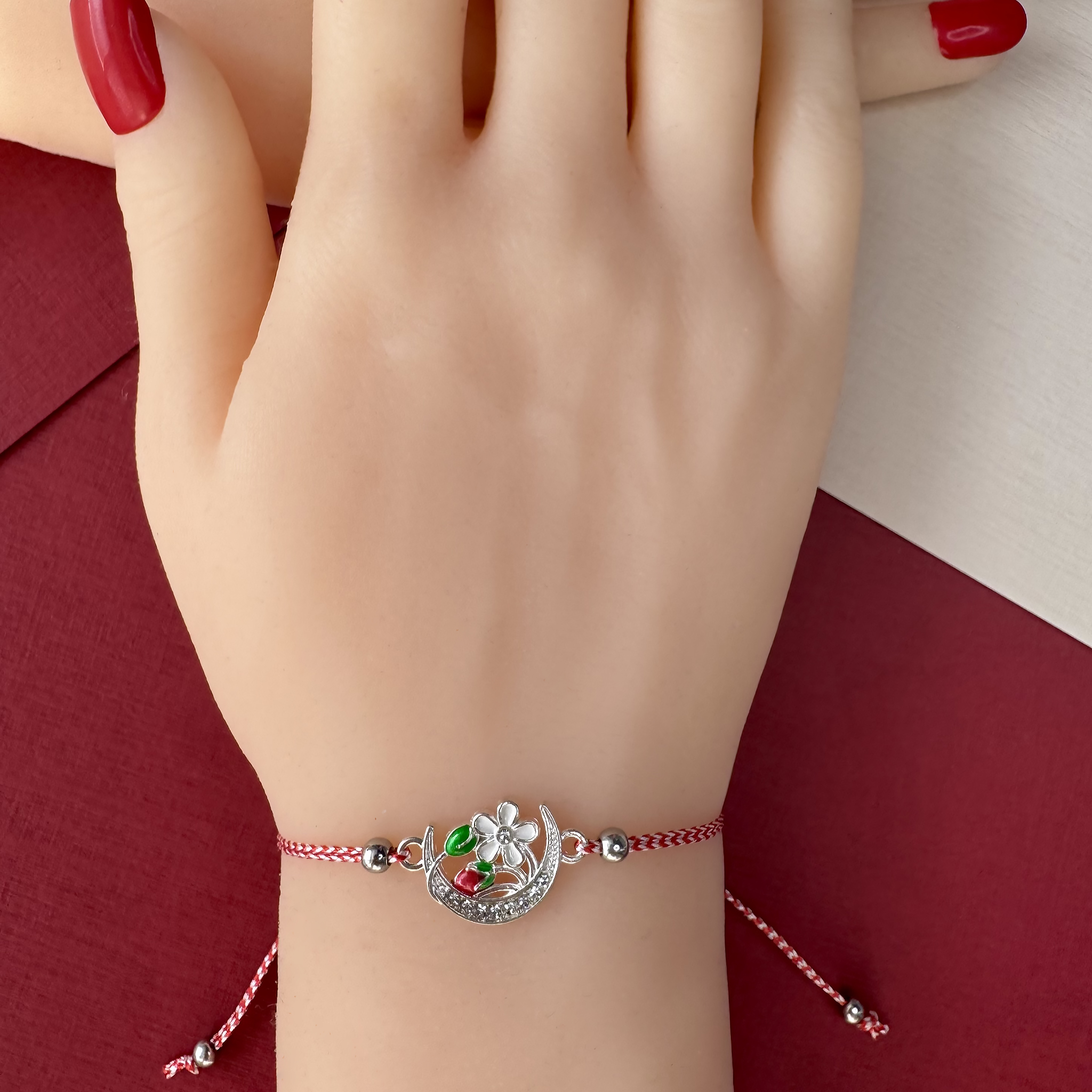Această brățară transmite emoția renașterii și a purității naturii prin ghioceii gingași și floricica delicată. Combinația cu șnurul alb-roșu simbolizează armonia tradiției cu frumusețea prezentului, amintind de bucuria primăverii și legăturile autentice dintre oameni. Este o bijuterie care inspiră speranță, optimism și afecțiune.