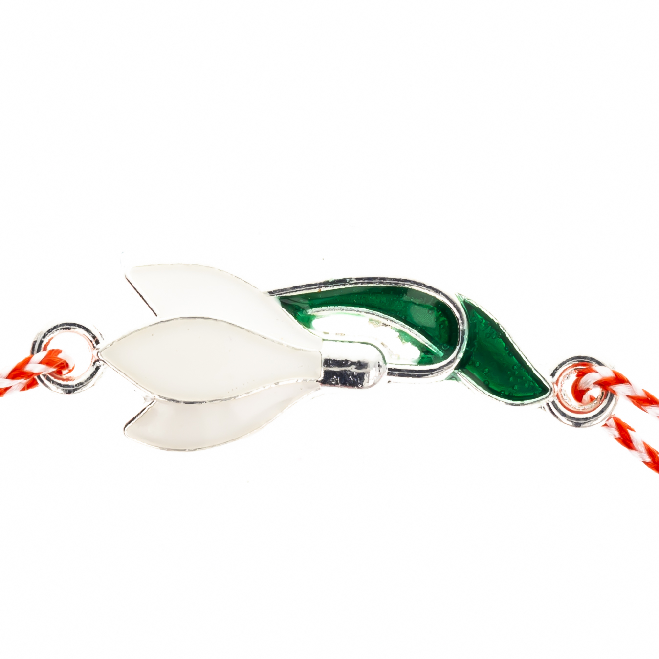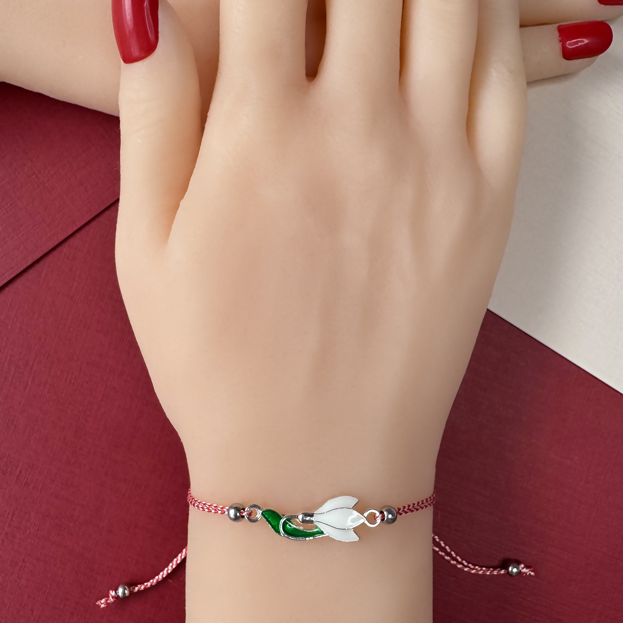 Această brățară transmite emoția renașterii și a naturii prin pandantivul ghiocel, simbol al primăverii și al începuturilor noi. Combinată cu șnurul alb-roșu tradițional, bijuteria evocă armonia dintre tradiție și momentele speciale petrecute alături de cei dragi. Este un accesoriu care inspiră optimism, gingășie și emoții calde.
