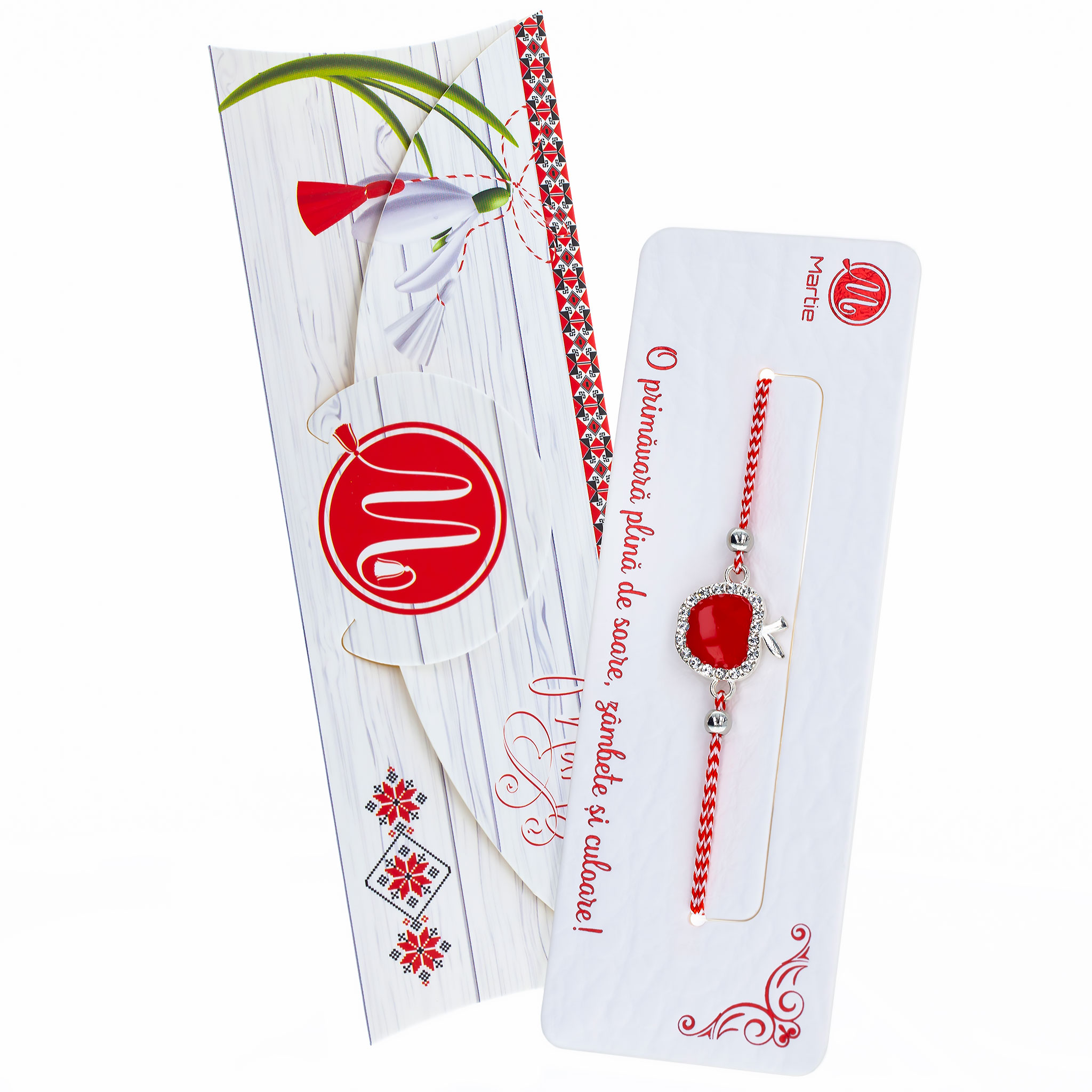 - Brățară Mărțișor cu fir textil alb-roșu, pandantiv măr, ambalată pe suport de carton cu mesaj de primăvară, însoțită de ambalaj tip plic, pregătită cu grijă pentru a fi oferită drept un cadou special.