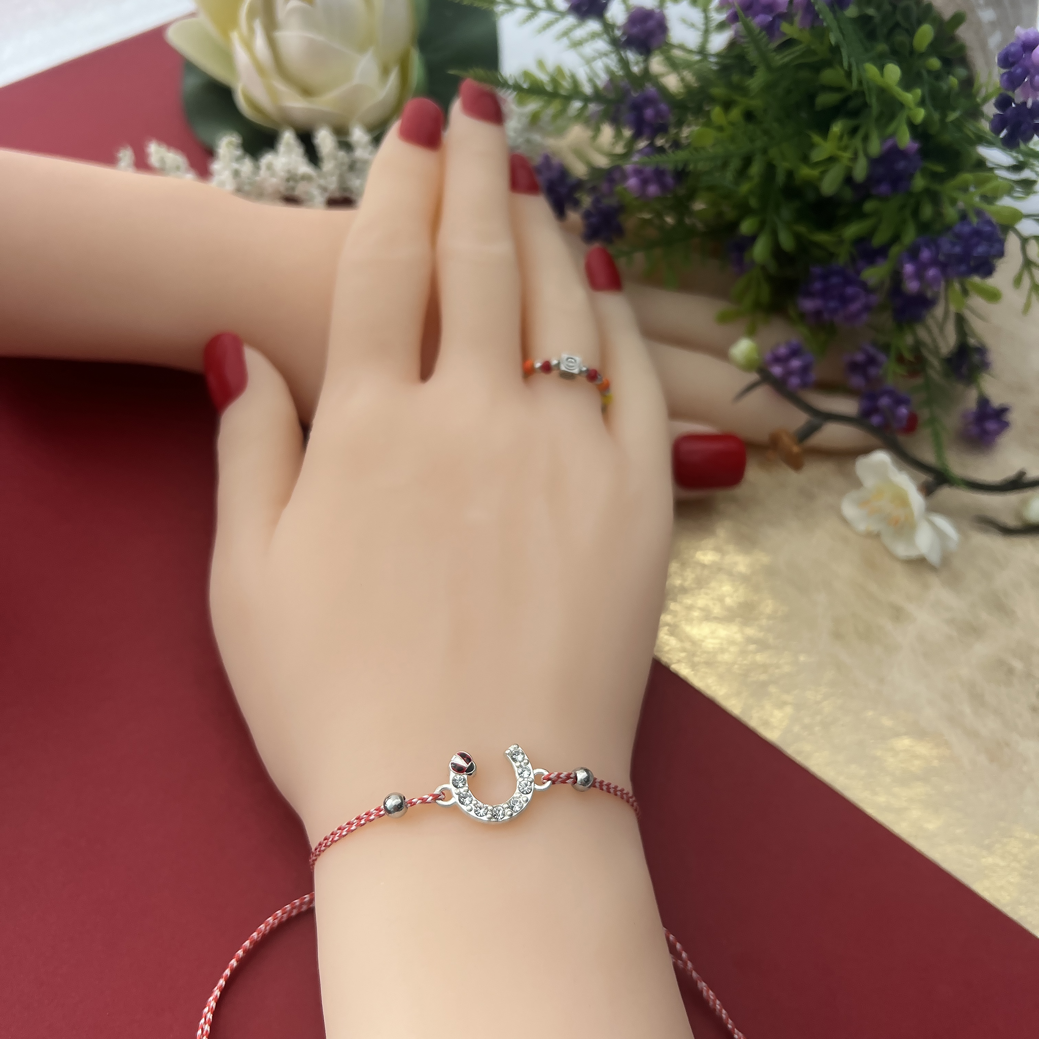Această brățară combină simbolurile norocului cu detalii pline de gingășie. Potcoava aduce stabilitate și protecție, buburuza oferă veselie și energie pozitivă, iar șnurul alb-roșu completează armonios designul. Este o bijuterie delicată și plină de semnificație, menită să inspire optimism și bucurie purtătorului.