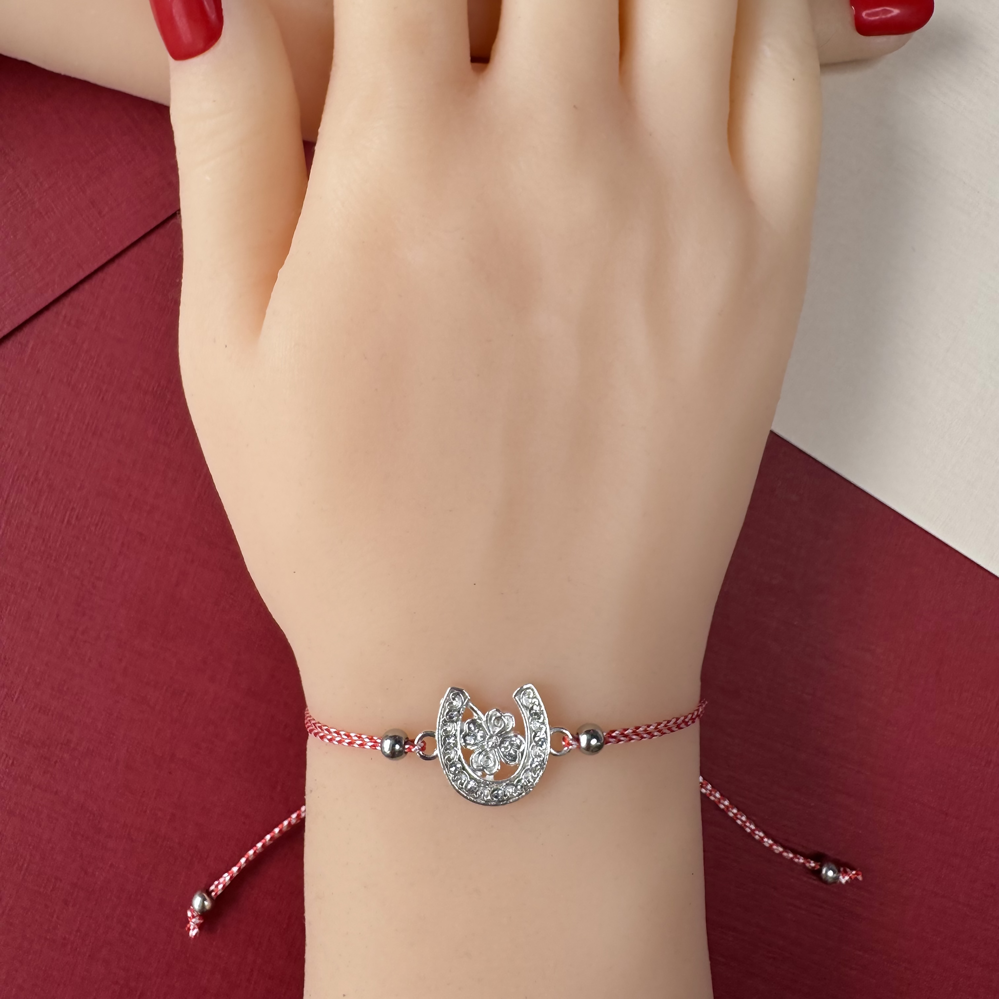 Această brățară transmite emoția norocului și a bunăstării prin potcoava simbolică și trifoiul plin de vitalitate. Combinată cu șnurul alb-roșu tradițional, bijuteria evocă armonia dintre tradiție și momentele speciale, amintind de legăturile autentice și bucuria de a dărui. Este un accesoriu care inspiră protecție, optimism și sentimente calde.
