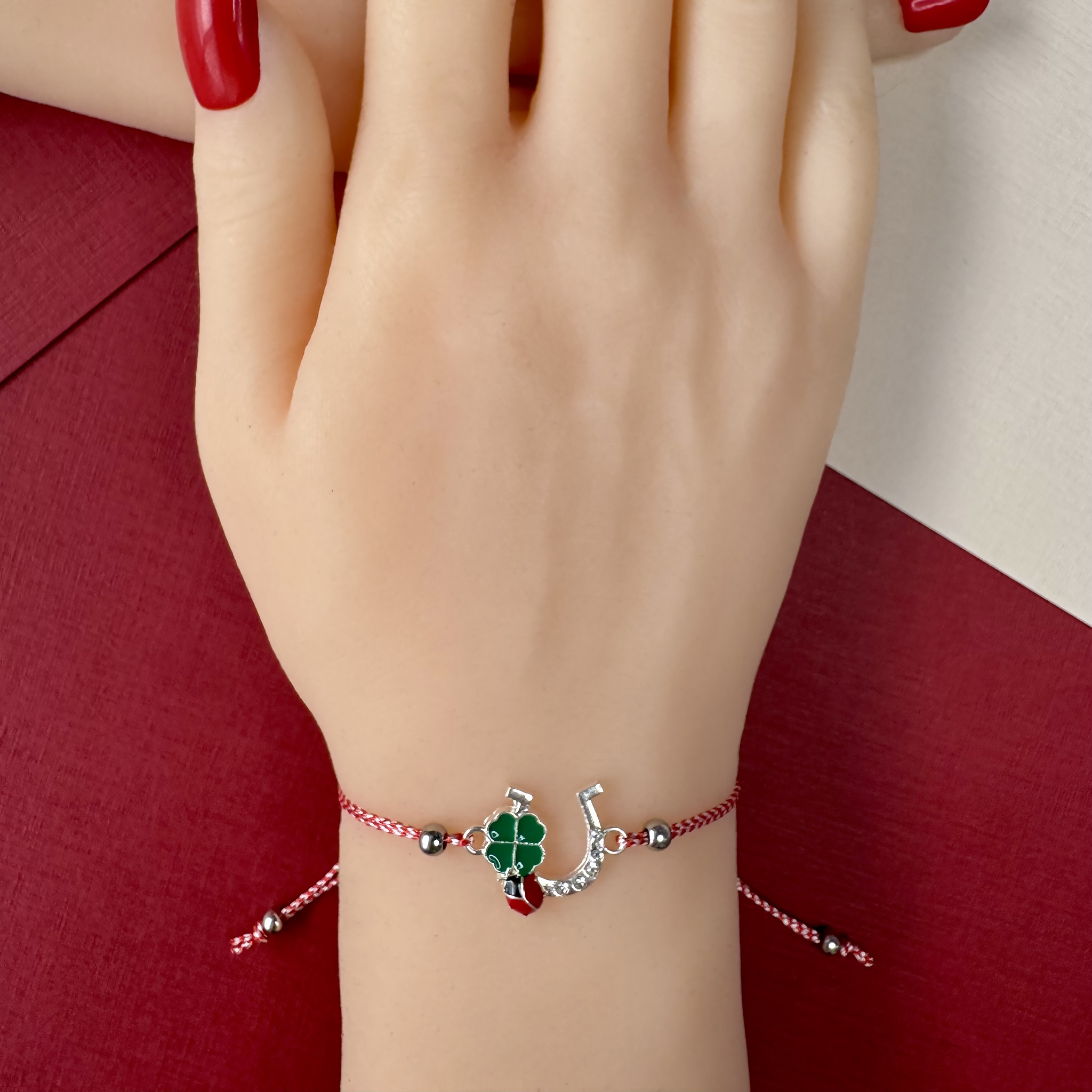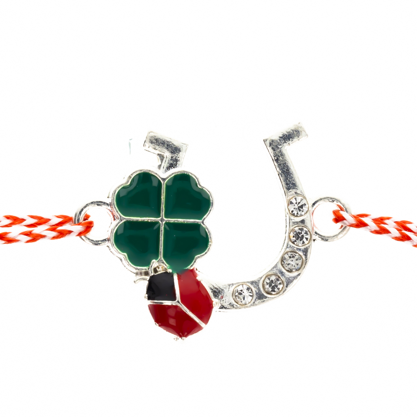 Această brățară aduce pe încheietura ta simbolurile norocului și bucuriei prin pandantivul care combină o potcoavă norocoasă, un trifoi verde și o buburuză jucăușă. Firul alb-roșu tradițional se împletește armonios cu bijuteria, evocând legătura dintre tradiție și frumusețea prezentului.