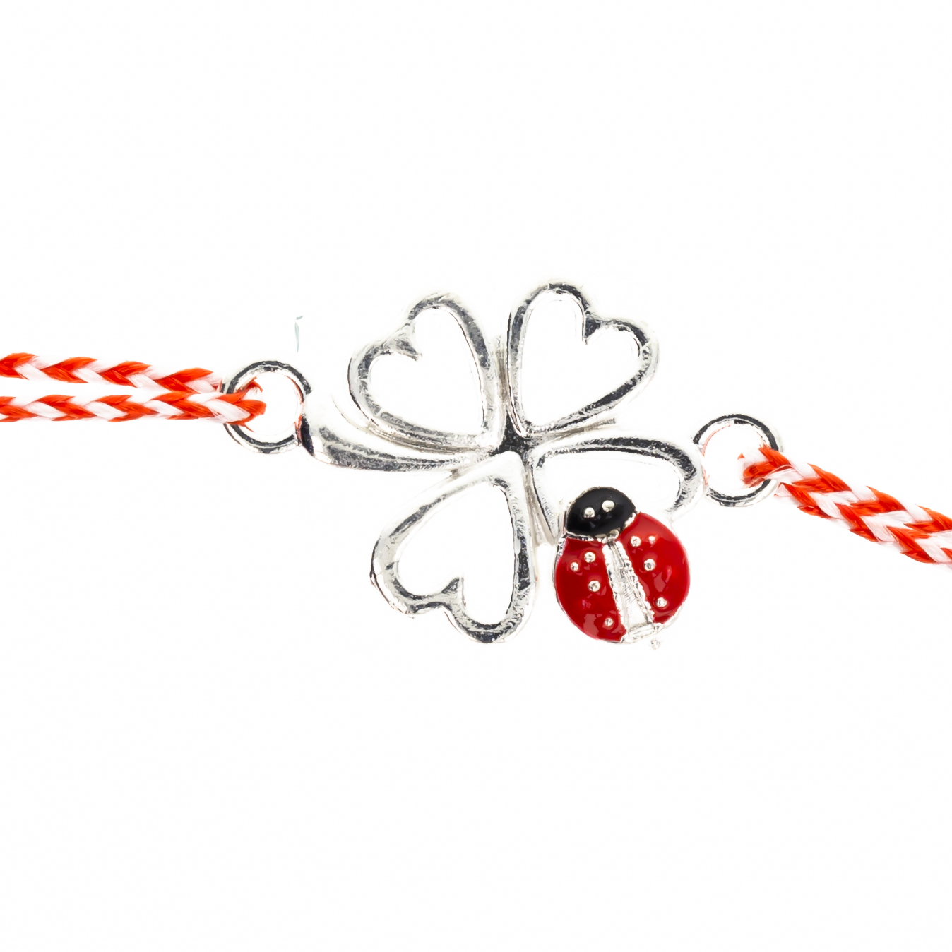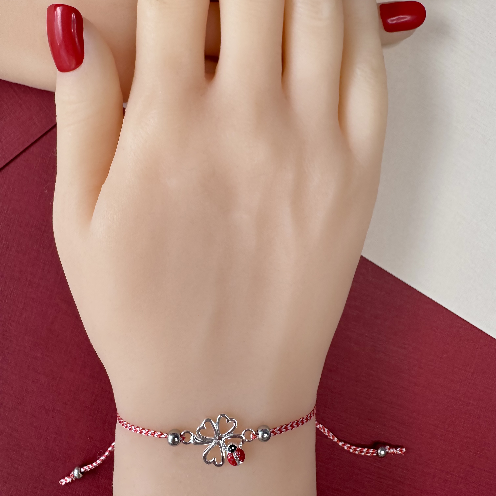 Această brățară Mărțișor este o bijuterie plină de simbolism și energie pozitivă, combinând tradiția șnurului alb-roșu cu talismanele norocului: trifoiul și buburuza.