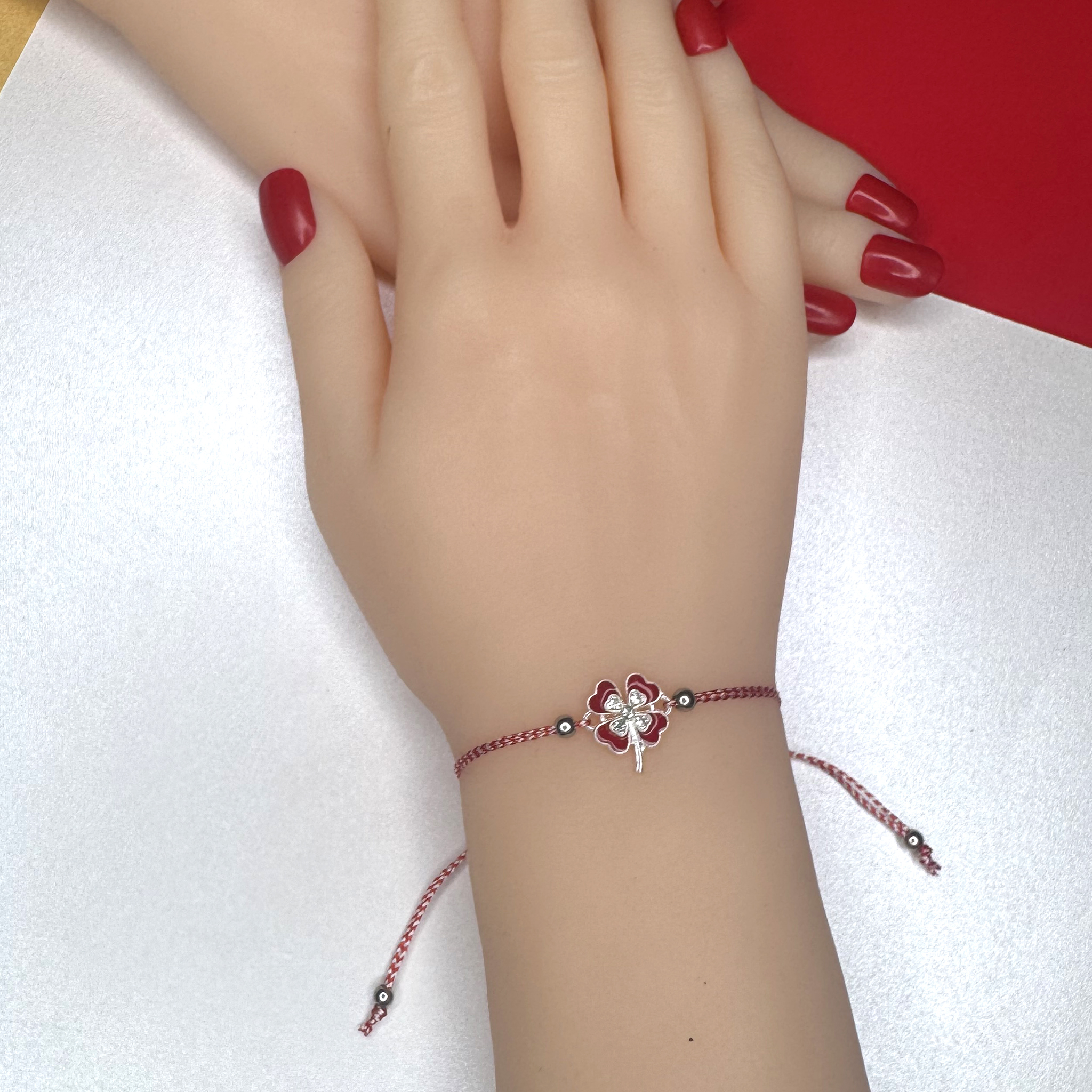 - Brățară Mărțișor cu fir textil alb-roșu, pandantiv trifoi roșu, ambalată pe suport de carton cu mesaj de primăvară, însoțită de ambalaj tip plic, pregătită cu grijă pentru a fi oferită drept un cadou special.
