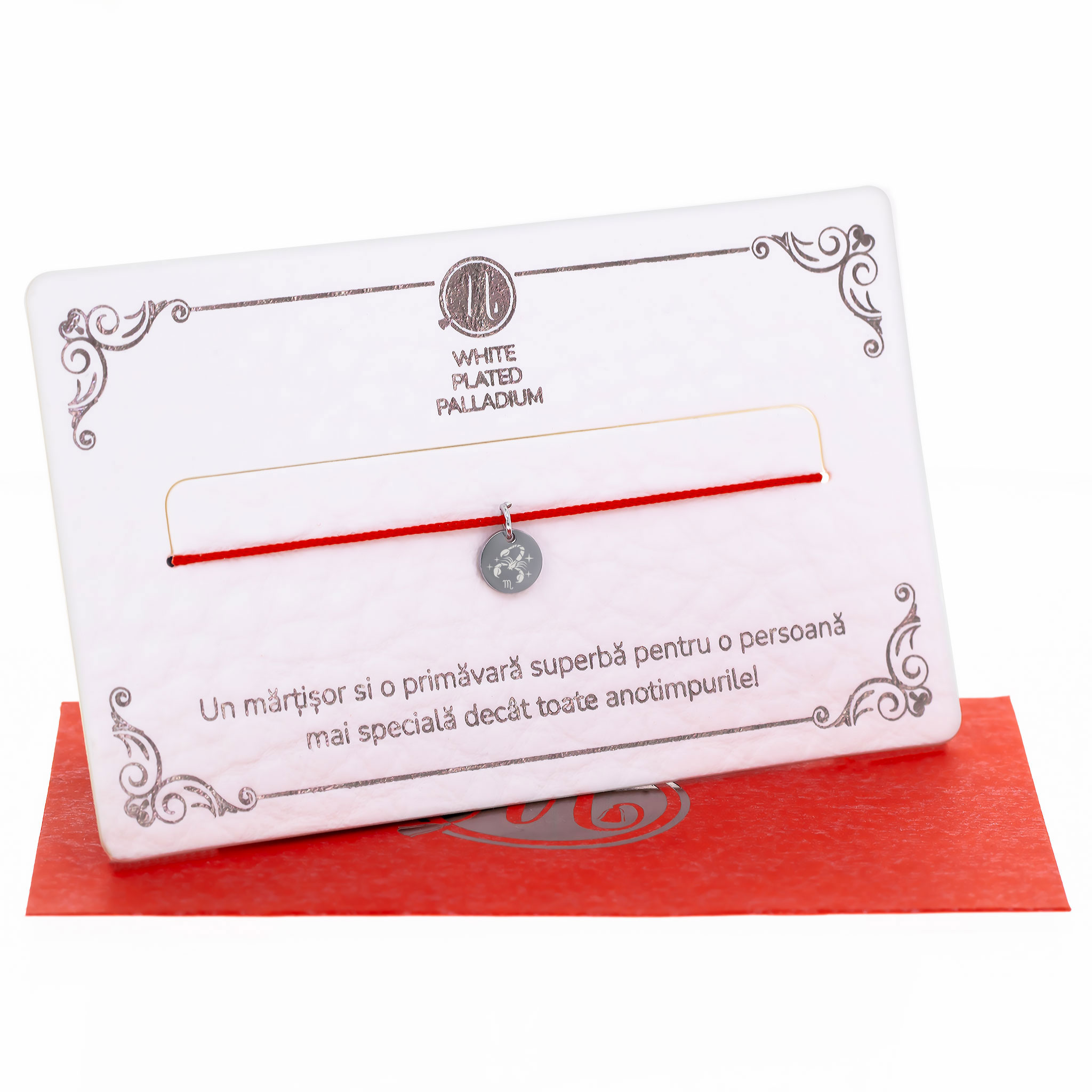 - Material: Fir textil roșu, charm argintiu white palladium zodia scorpion;