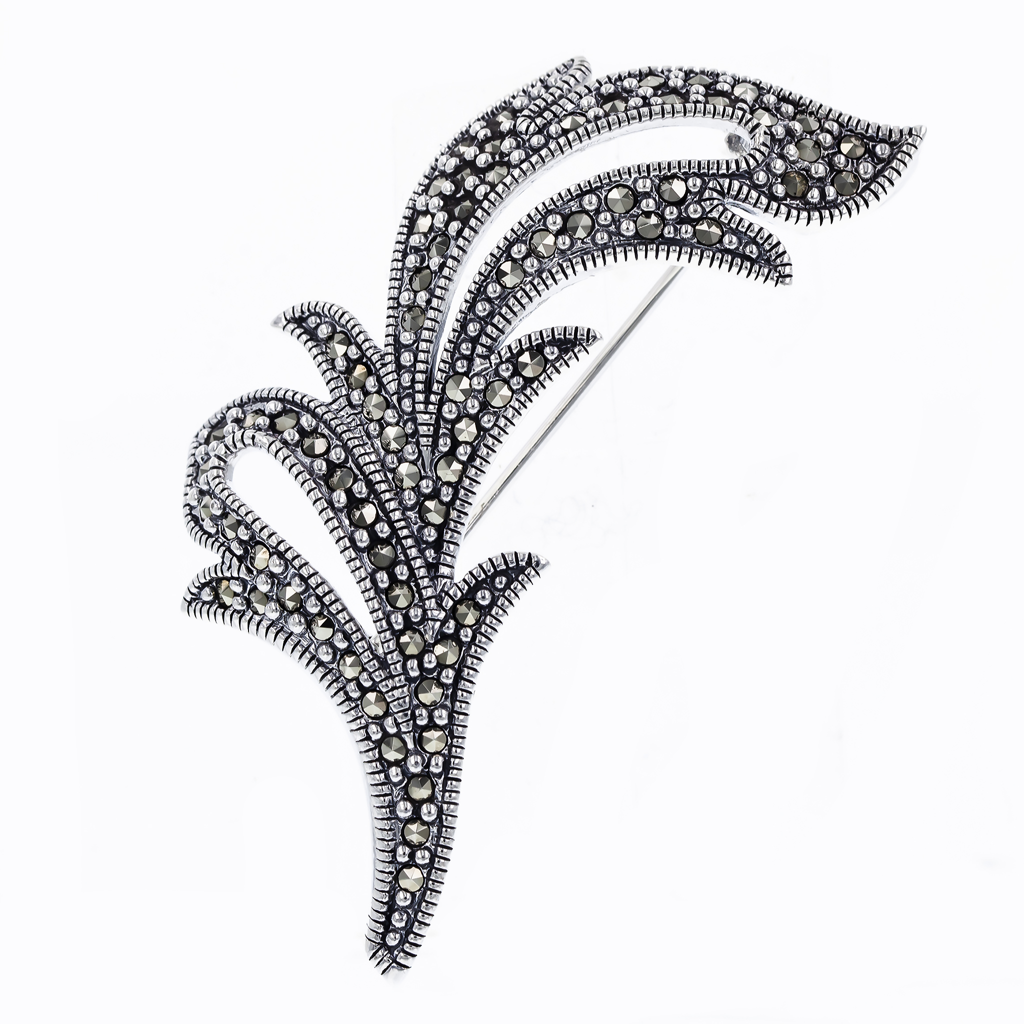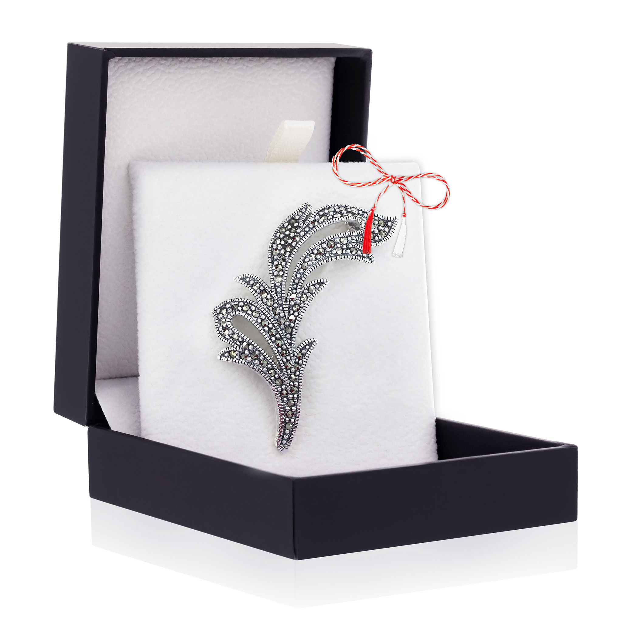 Această broșă din argint, sub forma unei frunze și decorată cu marcasite, este o bijuterie delicată și elegantă, inspirată din frumusețea naturii.