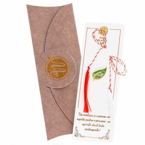 - Broșă Mărțișor Fir de Ghiocel, șnur Marțișor alb-roșu, însoțită de suport pentru broșă și plic, pregătită cu grijă pentru a fi oferită ca un cadou special, simbol al tradiției.