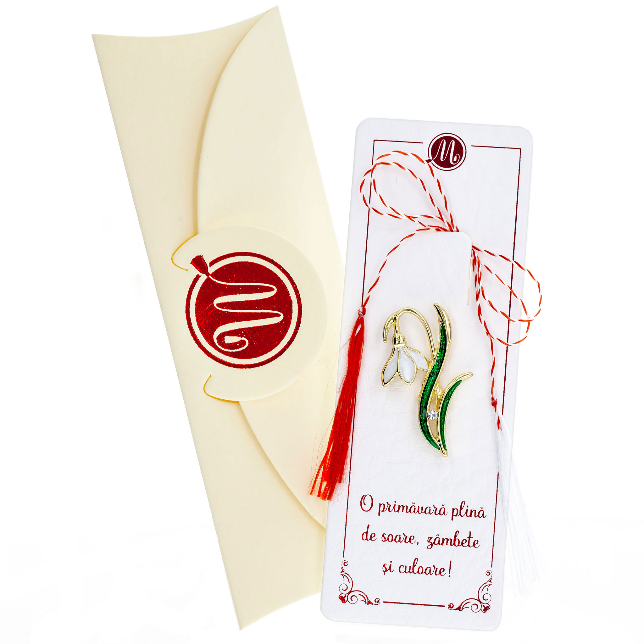 - Broșă Mărțișor Ghiocel, șnur Marțișor alb-roșu, însoțită de suport pentru broșă și plic, pregătită cu grijă pentru a fi oferită ca un cadou special, simbol al tradiției.
