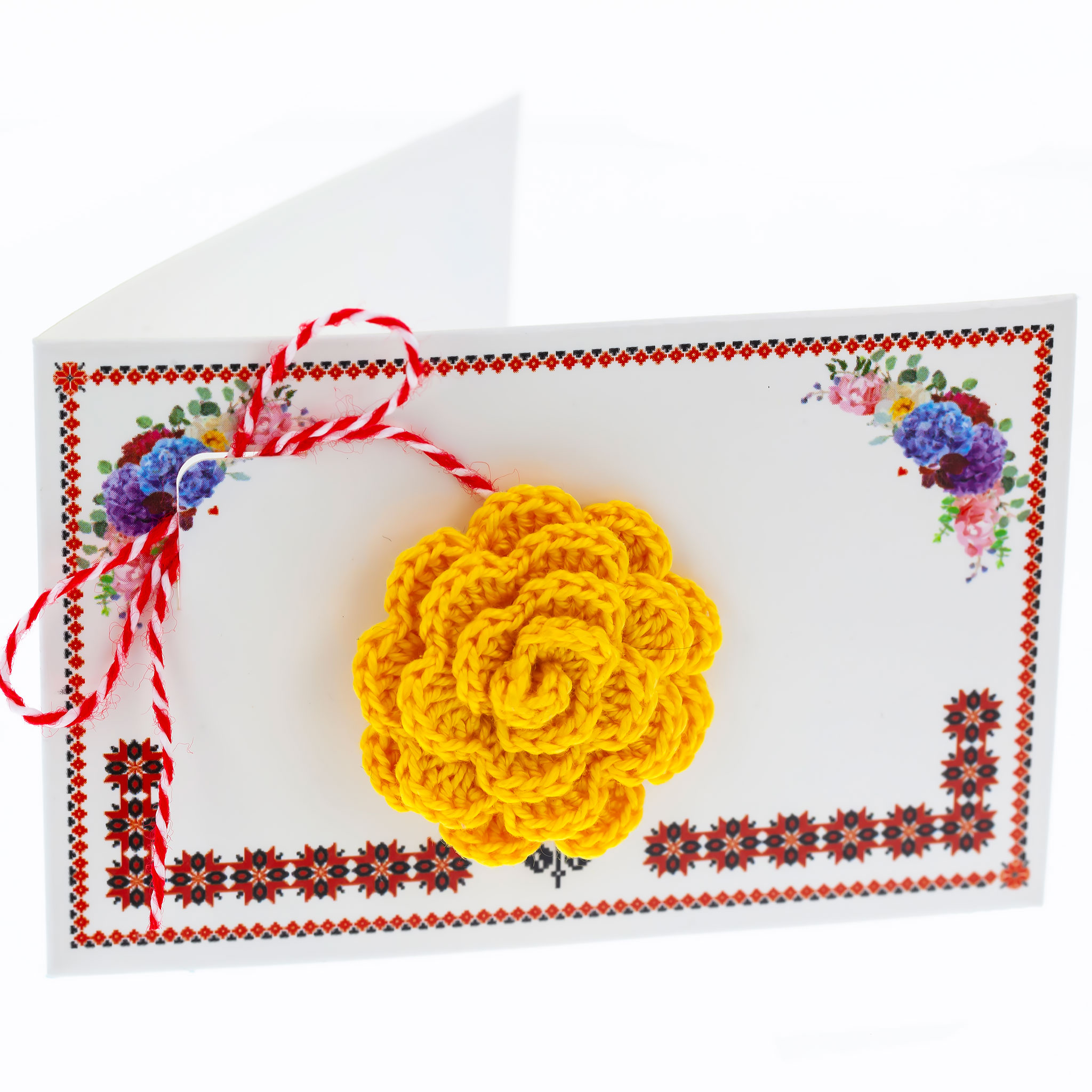 - Broșă Mărțișor Hand-Made Trandafir Galben, șnur Marțișor alb-roșu, însoțită de suport pentru broșă, creată cu dragoste și dedicare pentru a fi oferită ca un cadou special, simbol al tradiției.