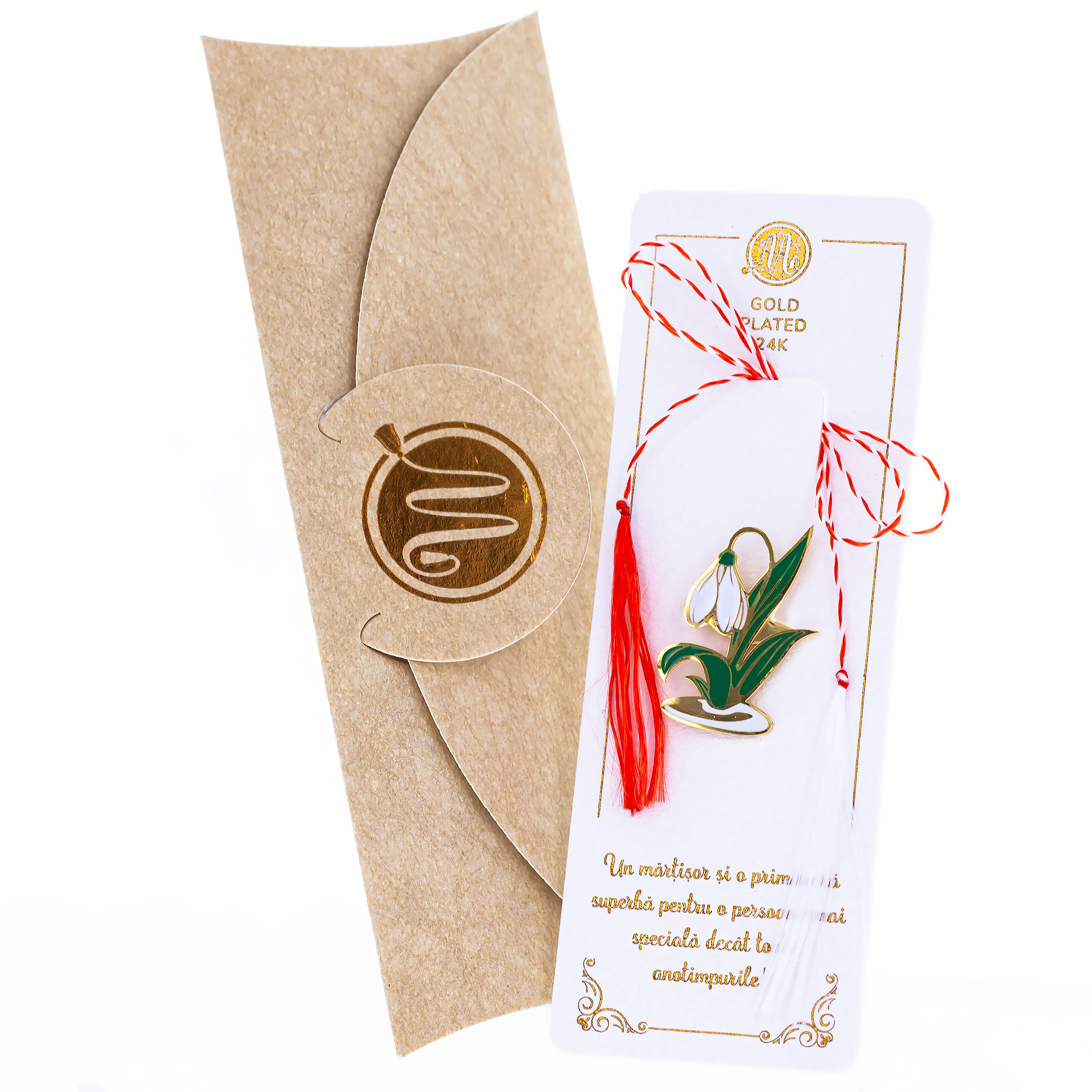 - Broșă Mărțișor Iris Gold Plated Boboc de Ghiocel, șnur Marțișor alb-roșu, însoțită de suport pentru broșă și plic, pregătită cu grijă pentru a fi oferită ca un cadou special, simbol al tradiției.